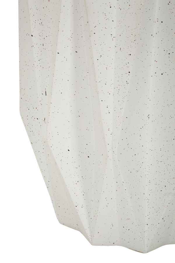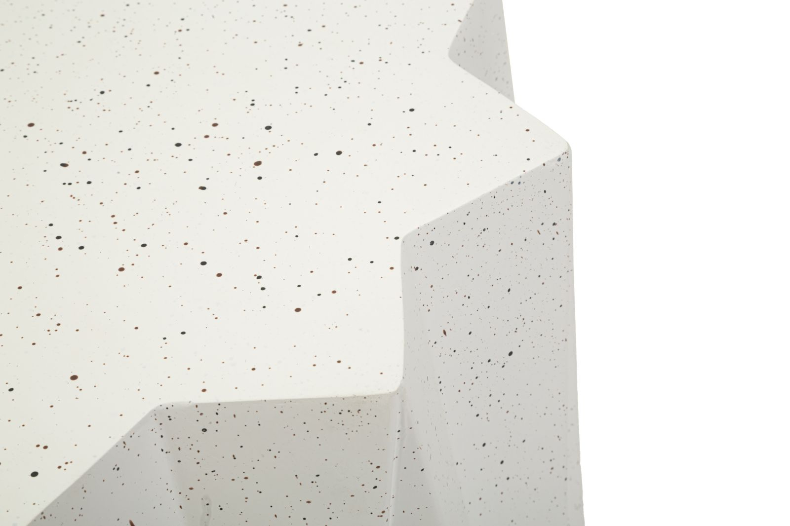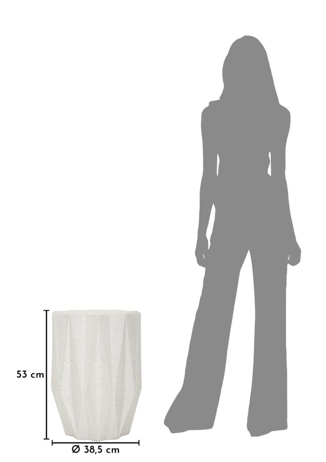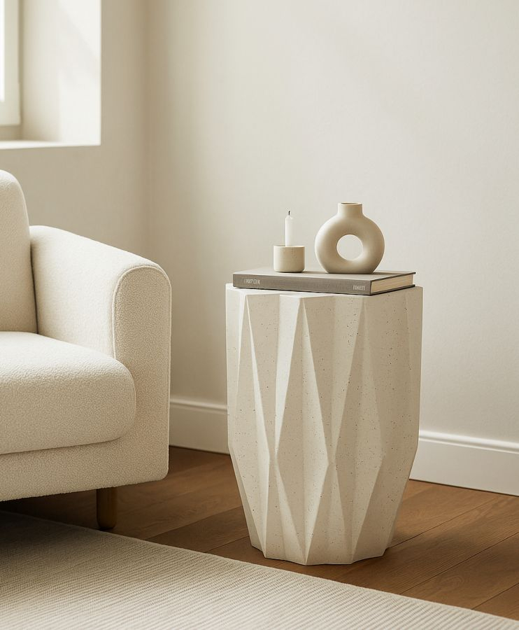 Liniile fațetate și geometria elegantă definesc această măsuță laterală cu prezență sculpturală. Efectul de piatră și finisajul crem luminos îi oferă un aspect rafinat, transformând-o într-un element decorativ potrivit pentru interioare moderne în care forma și textura devin expresie a stilului personal.