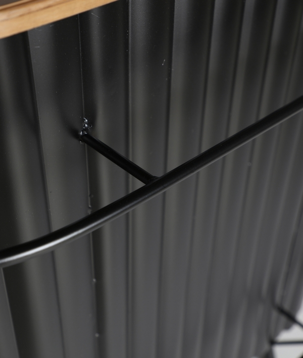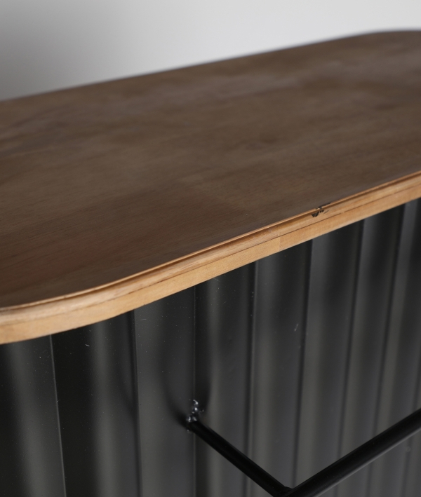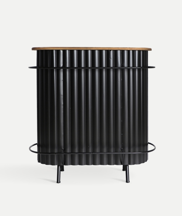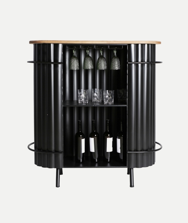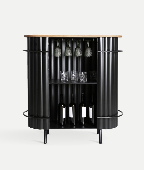 Meysse este definit de un design puternic și elegant, în care culoarea neagră și textura lemnului se îmbină cu liniile metalice ce conferă structură și personalitate. Forma frontală curbată și detaliile verticale metalice adaugă profunzime vizuală, transformând barul într-un element central al oricărui spațiu.