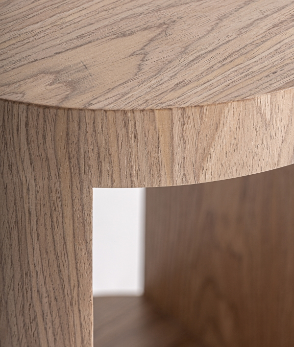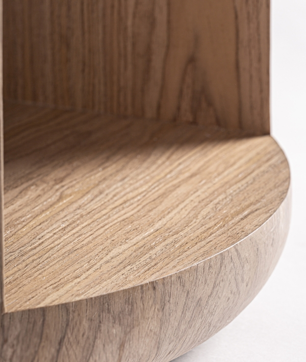 Blatul rotund, cu grosime accentuată, se așază pe o structură cilindrică ce integrează un spațiu deschis, util și ușor accesibil. Deschiderea laterală creează un joc de plin și gol care face piesa să pară ușoară vizual, în ciuda volumului său bine conturat.