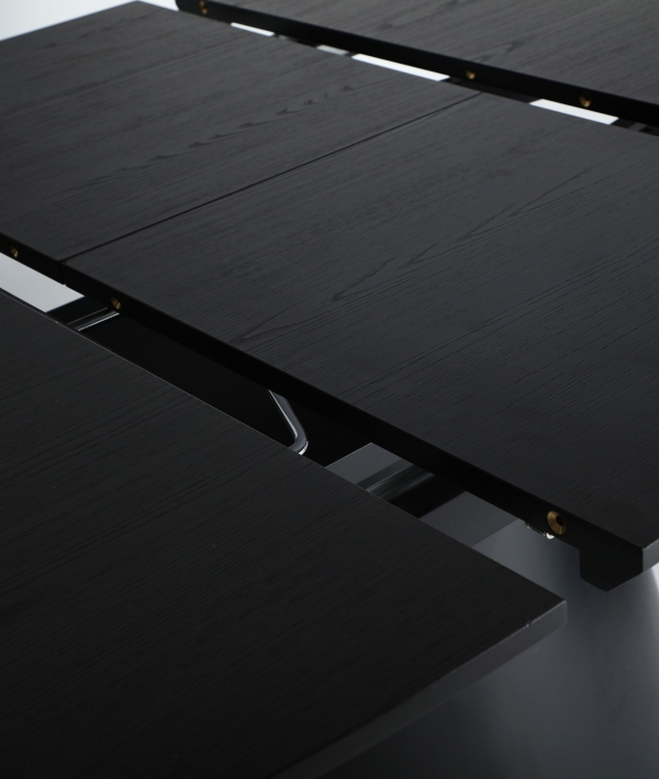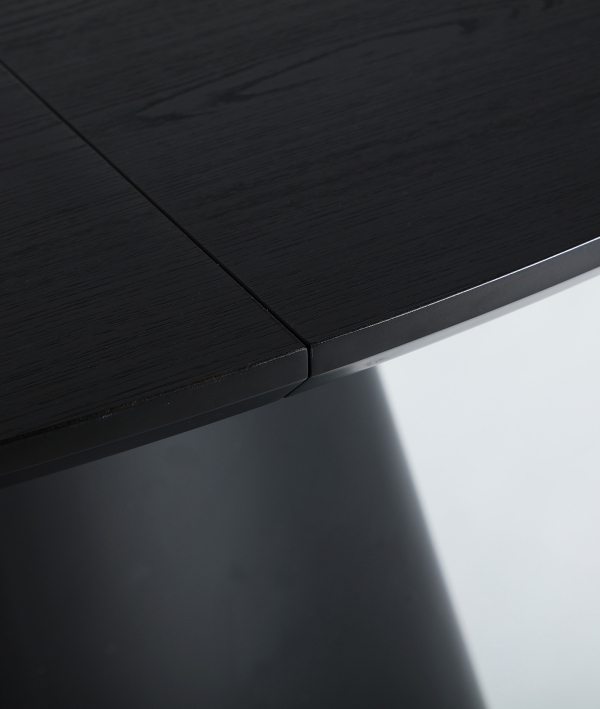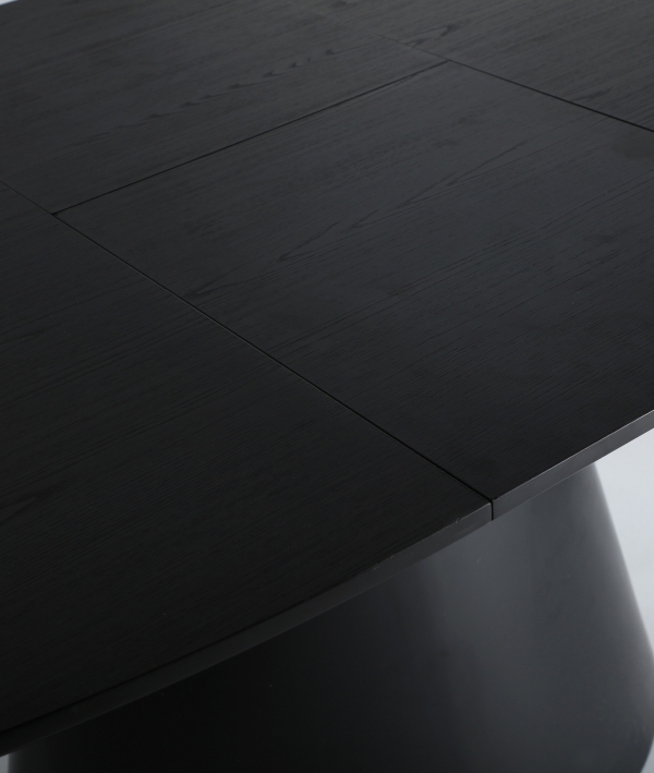 Masă extensibilă LIZANT în finisaj negru, realizată din melamină și MDF, concepută pentru a aduce funcționalitate și estetică modernă în orice sufragerie. Designul său contemporan cu picior central conic oferă stabilitate, dar și un impact vizual puternic, transformând această masă în piesa centrală a oricărui spațiu de dining.