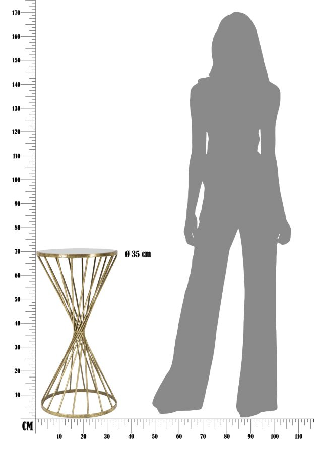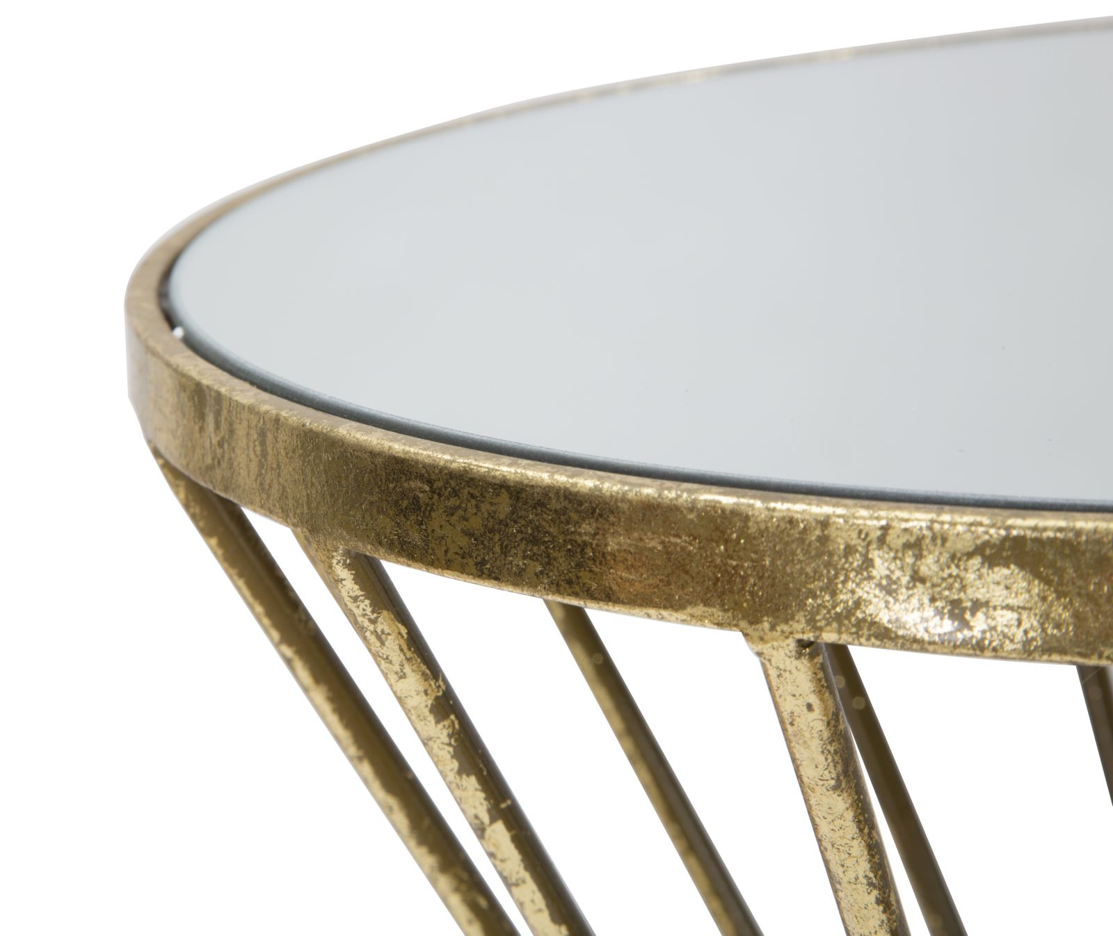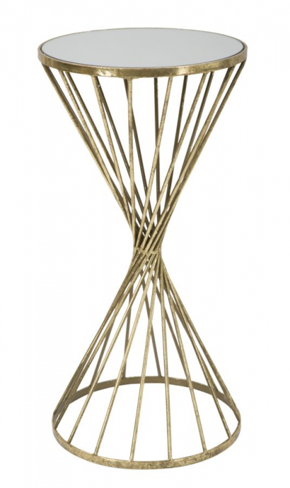 Măsuță laterală rotundă cu finisaj auriu antichizat și blat de oglindă. Cu forma sa deosebită, această piesă de mobilier pune în evidență obiectele decorative în living sau dormitor.