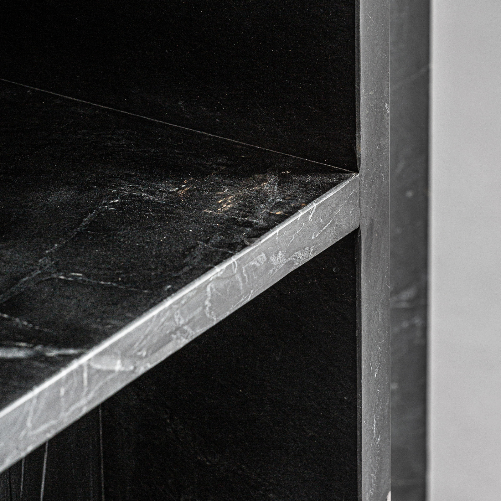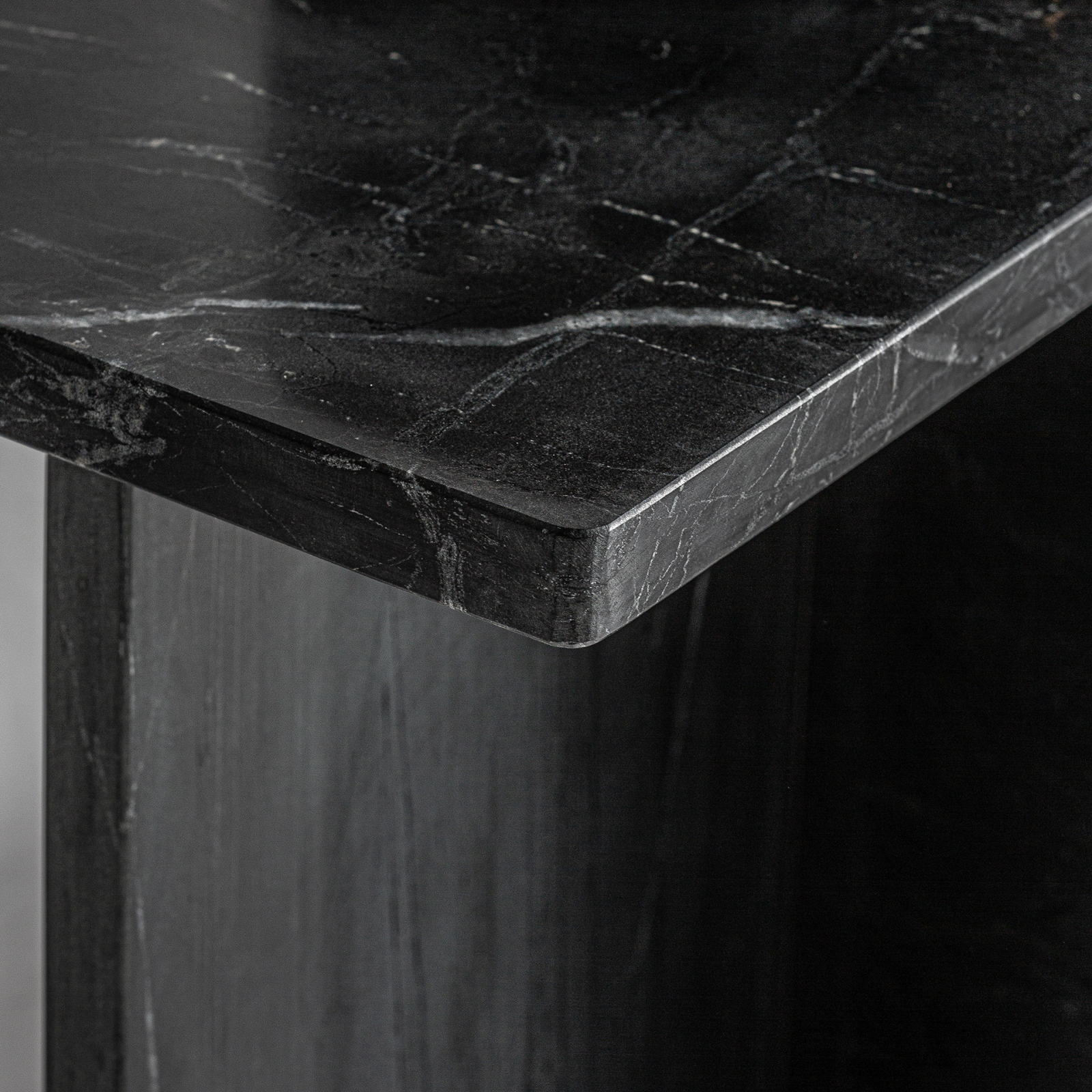 Marquina este o piesă sculpturală și funcțională, realizată integral din marmură neagră cu vinișoare naturale, ce îmbină glamourul esteticii Art Deco cu geometria arhitecturală contemporană. Silueta sa joacă subtil cu diferențele de nivel și volum, rezultând un obiect statement cu prezență vizuală puternică.