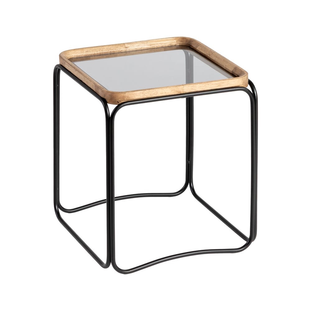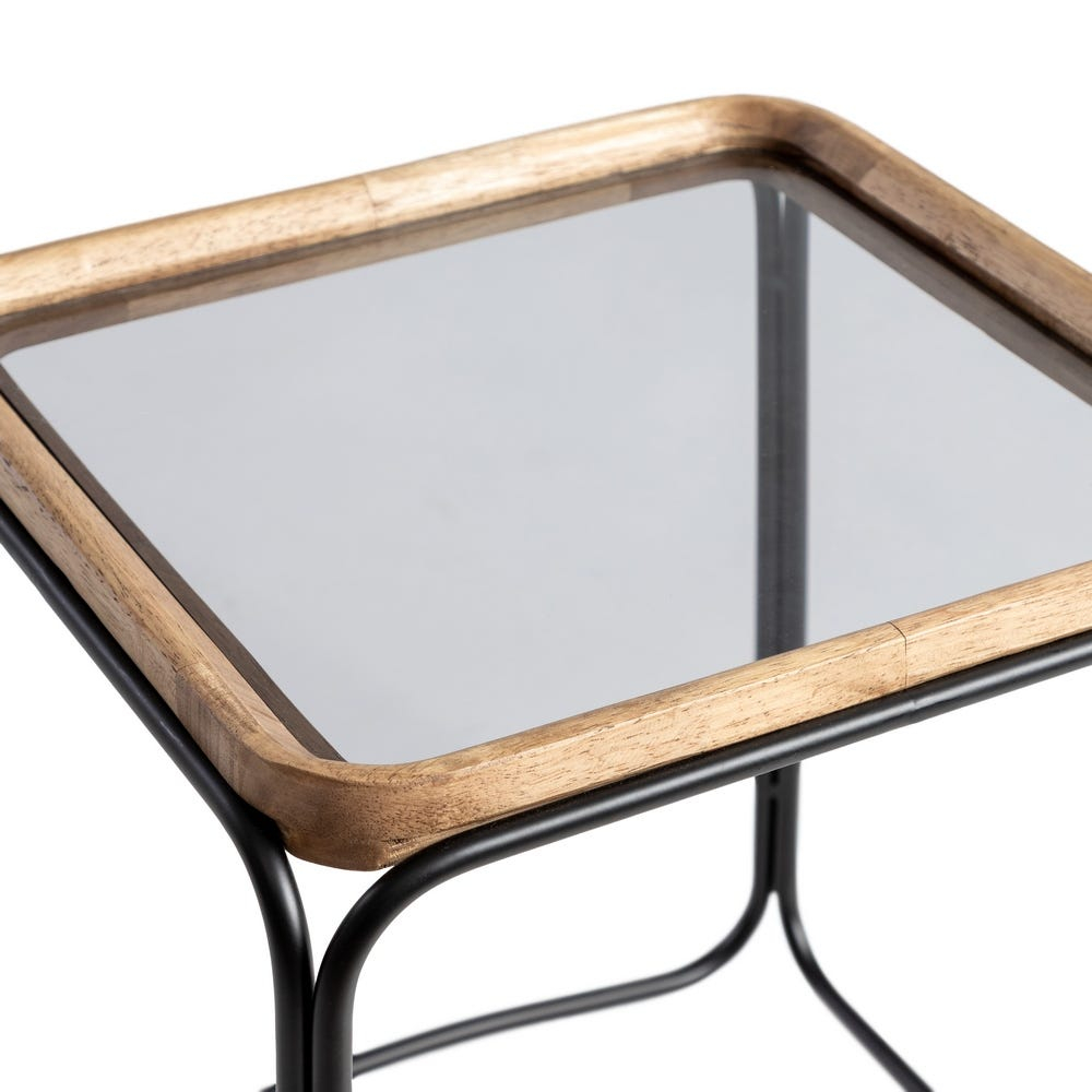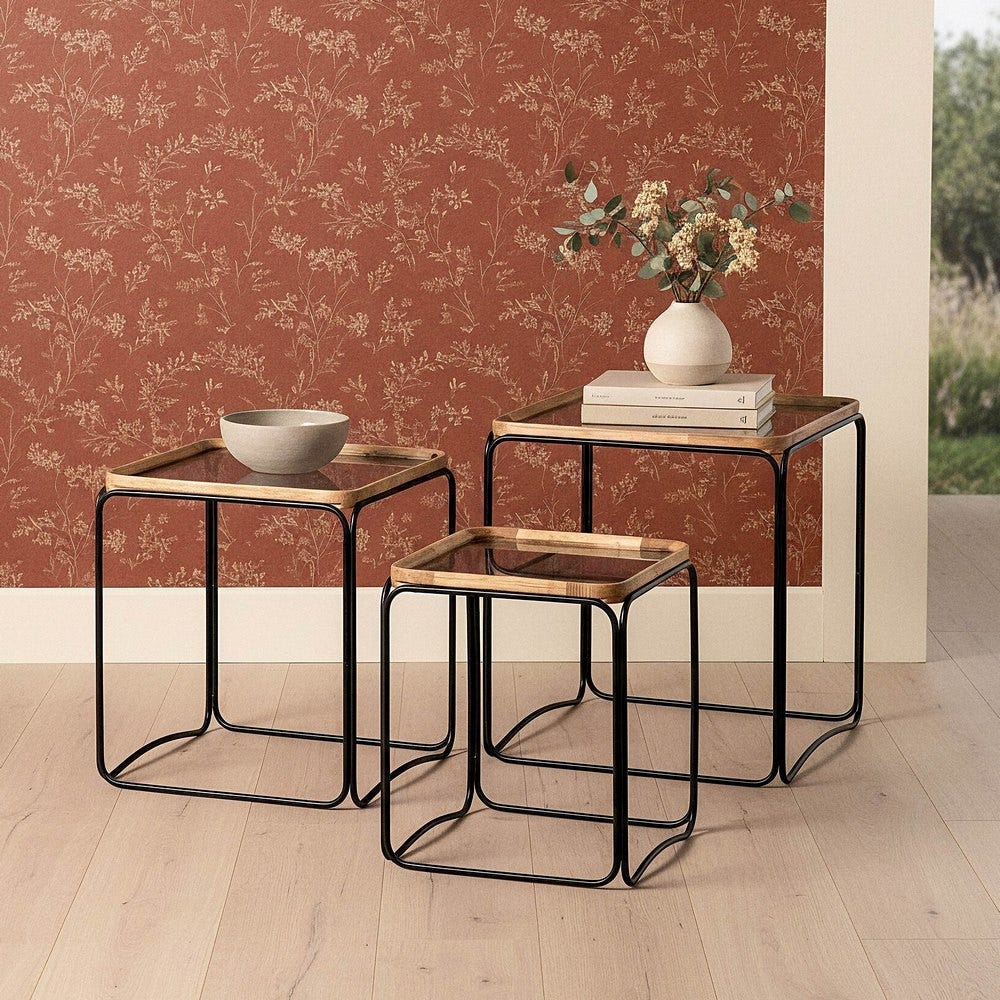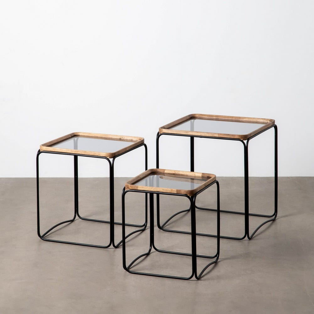 Set de 3 măsuțe laterale realizate din lemn de cauciuc cu finisaj natural, având cadru subțire din metal negru și blat din sticlă. Designul lor contemporan și versatil se potrivește perfect în living, dormitor sau hol, oferind un plus de stil și funcționalitate.