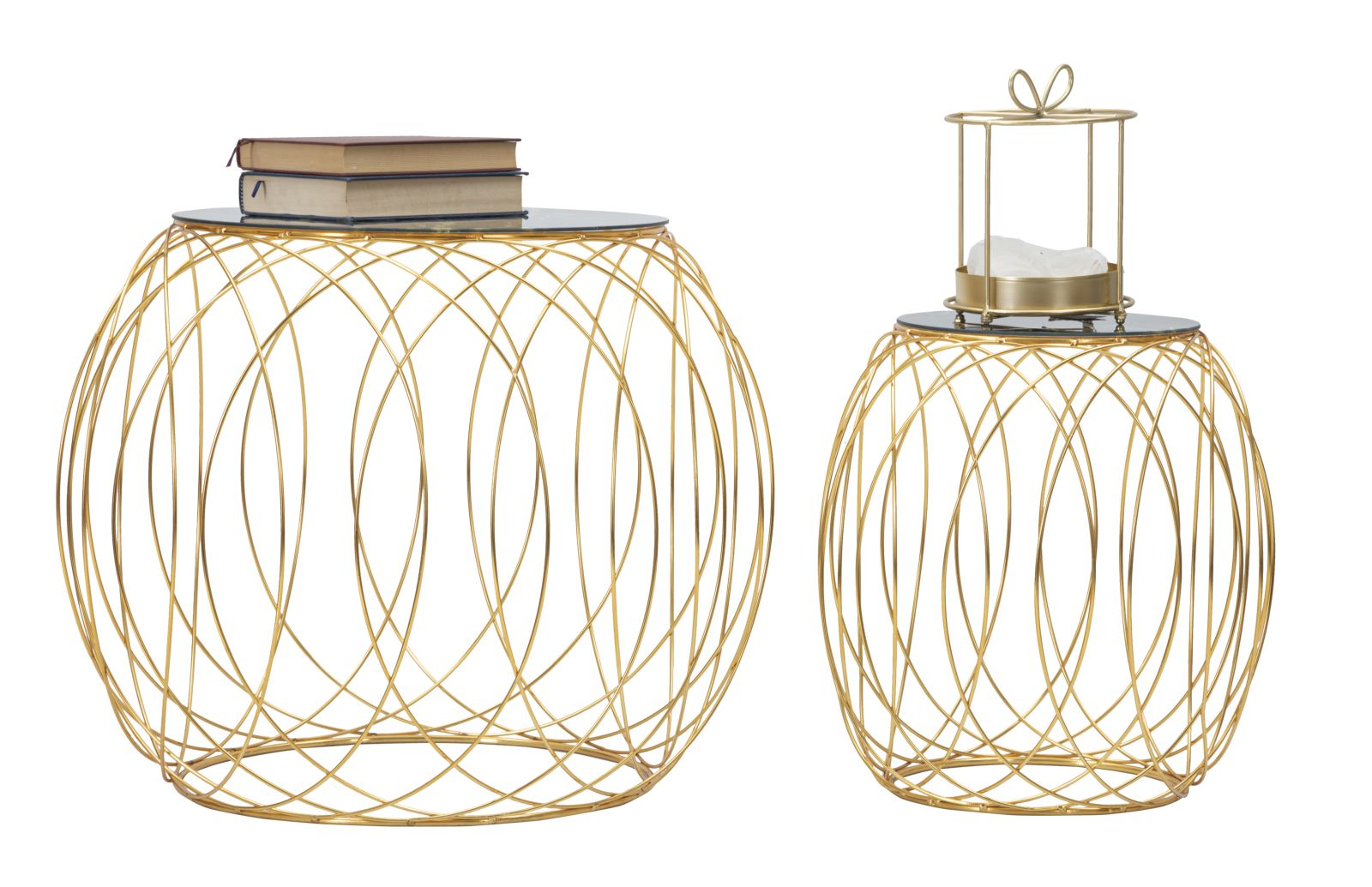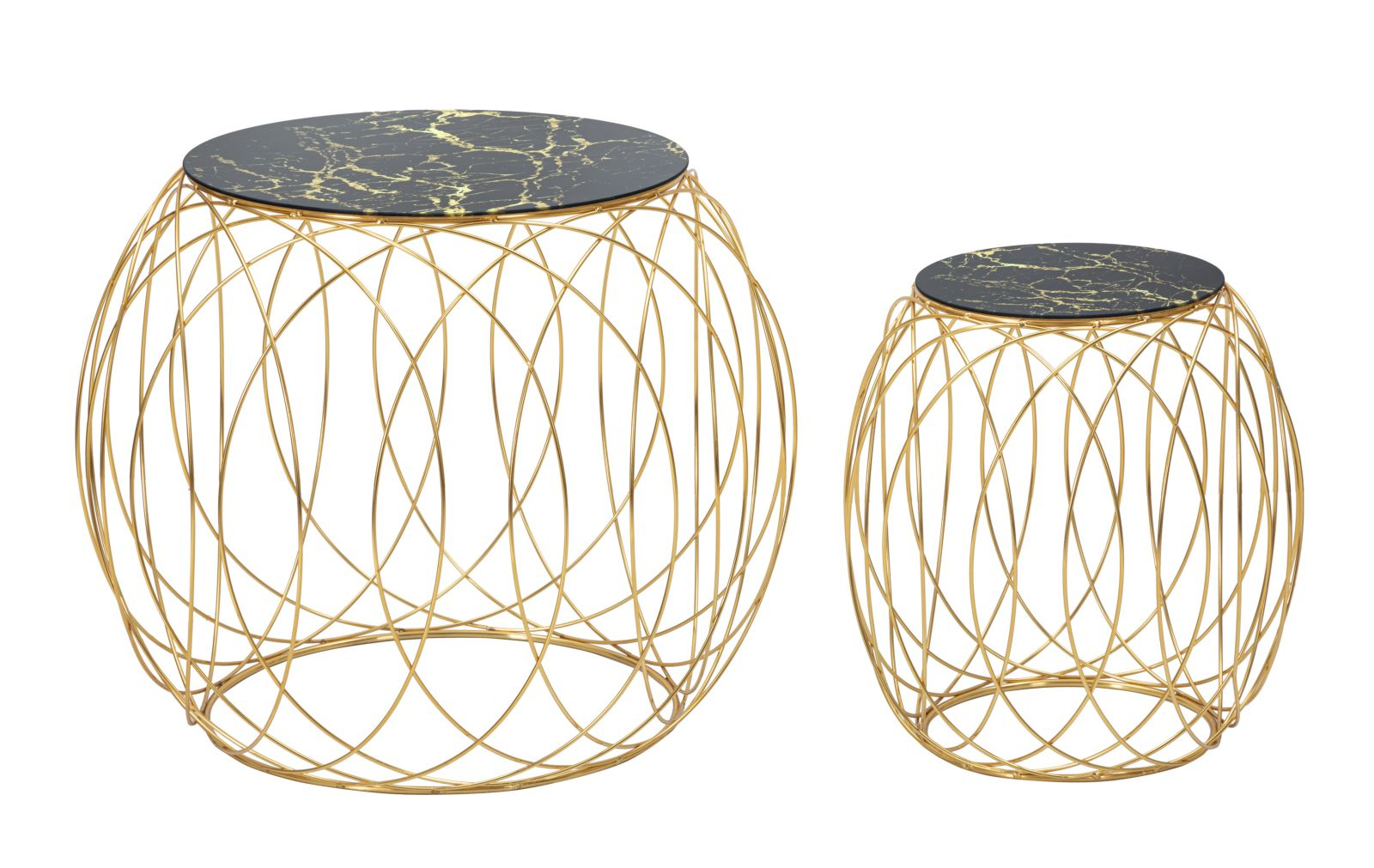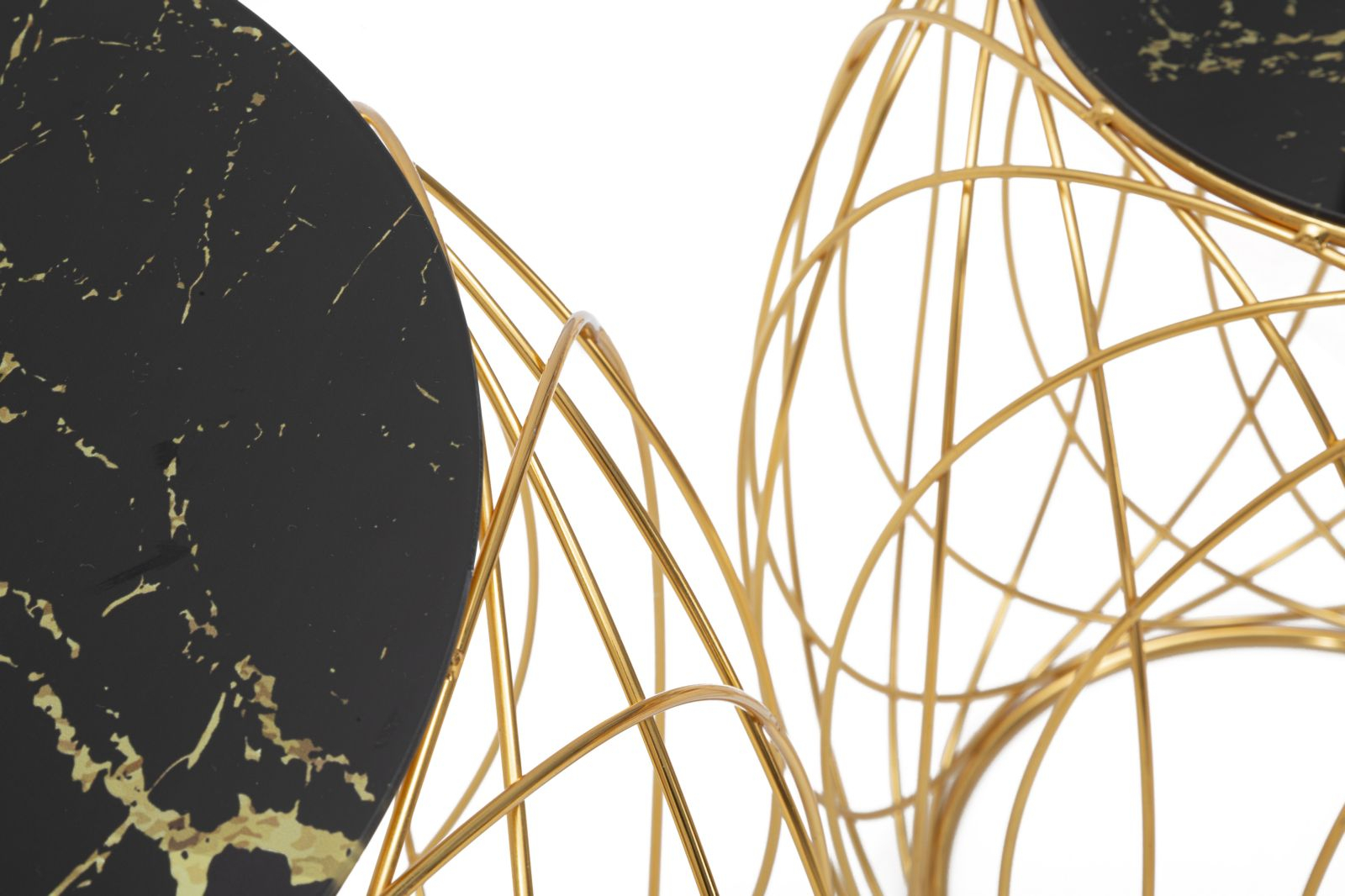 Setul de masute Ball este o declaratie de stil glam contemporan, ce imbina perfect geometria moderna cu textura sofisticata a materialelor. Structura aurie in forma de sfera deschisa este construita din fire metalice curbe ce se intersecteaza grafic, creand o silueta dinamica, dar aerisita. Blaturile rotunde din sticla securizata neagra cu model marmorat adauga un plus de rafinament, reflectand lumina si creand contrast cu baza aurie.