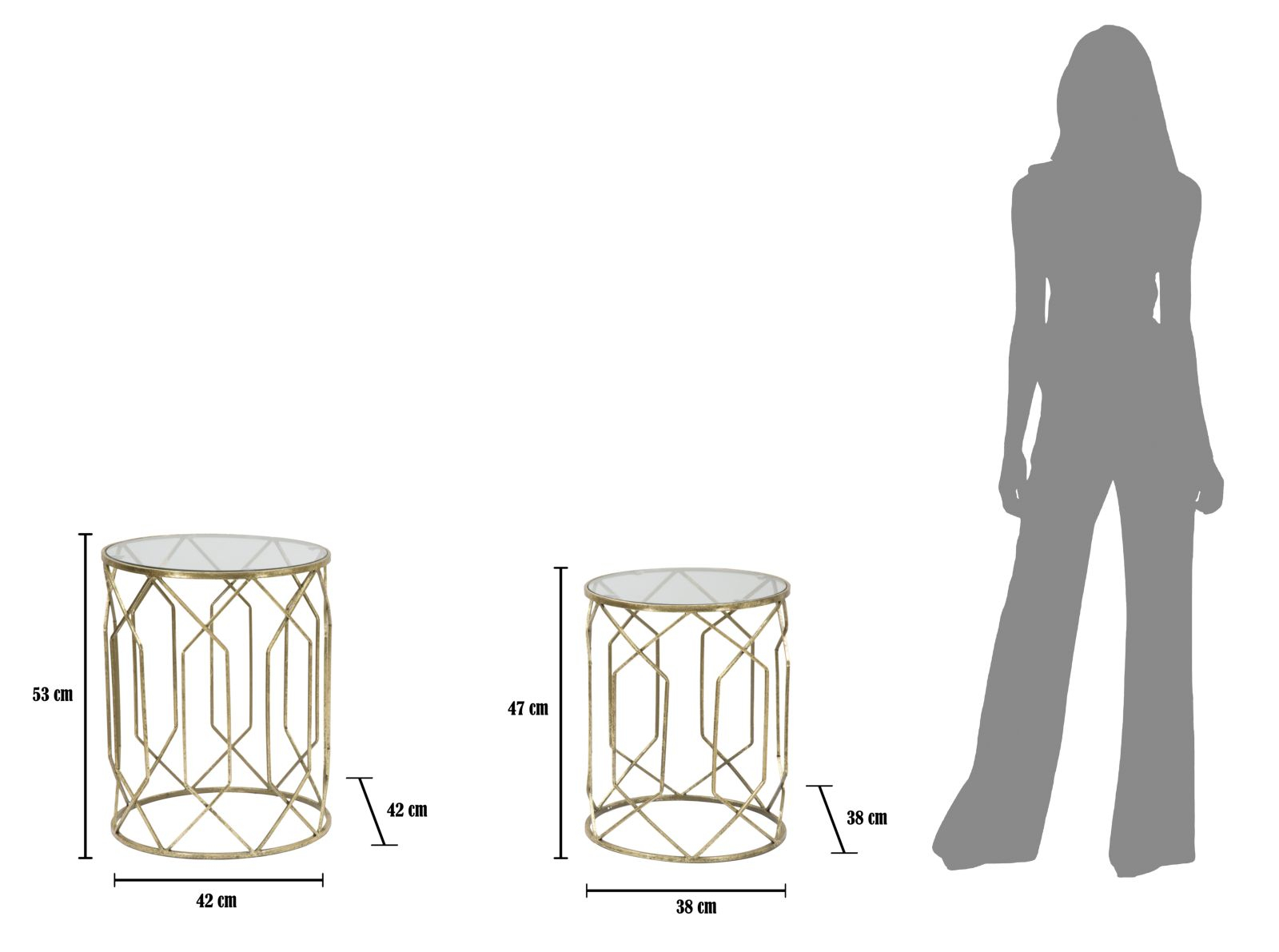 Dorești măsuțe laterale cu aspect antichizat pentru un interior cu personalitate? Soluția creativă este Setul de măsuțe aurii cu blat de sticlă Tunisi. Cu structură metalică aurie antichizată și blat de sticlă, aceste măsuțe rotunde adaugă un aer vintage glamour oricărui spațiu. Ideale pentru livinguri eclectice sau dormitoare cu tematică retro. Măsuțe laterale design original italian, de la Mauro Ferretti. Fabricate din fier și sticlă, cântăresc 5,5 kg și măsoară 42x53 cm și 38x47 cm.