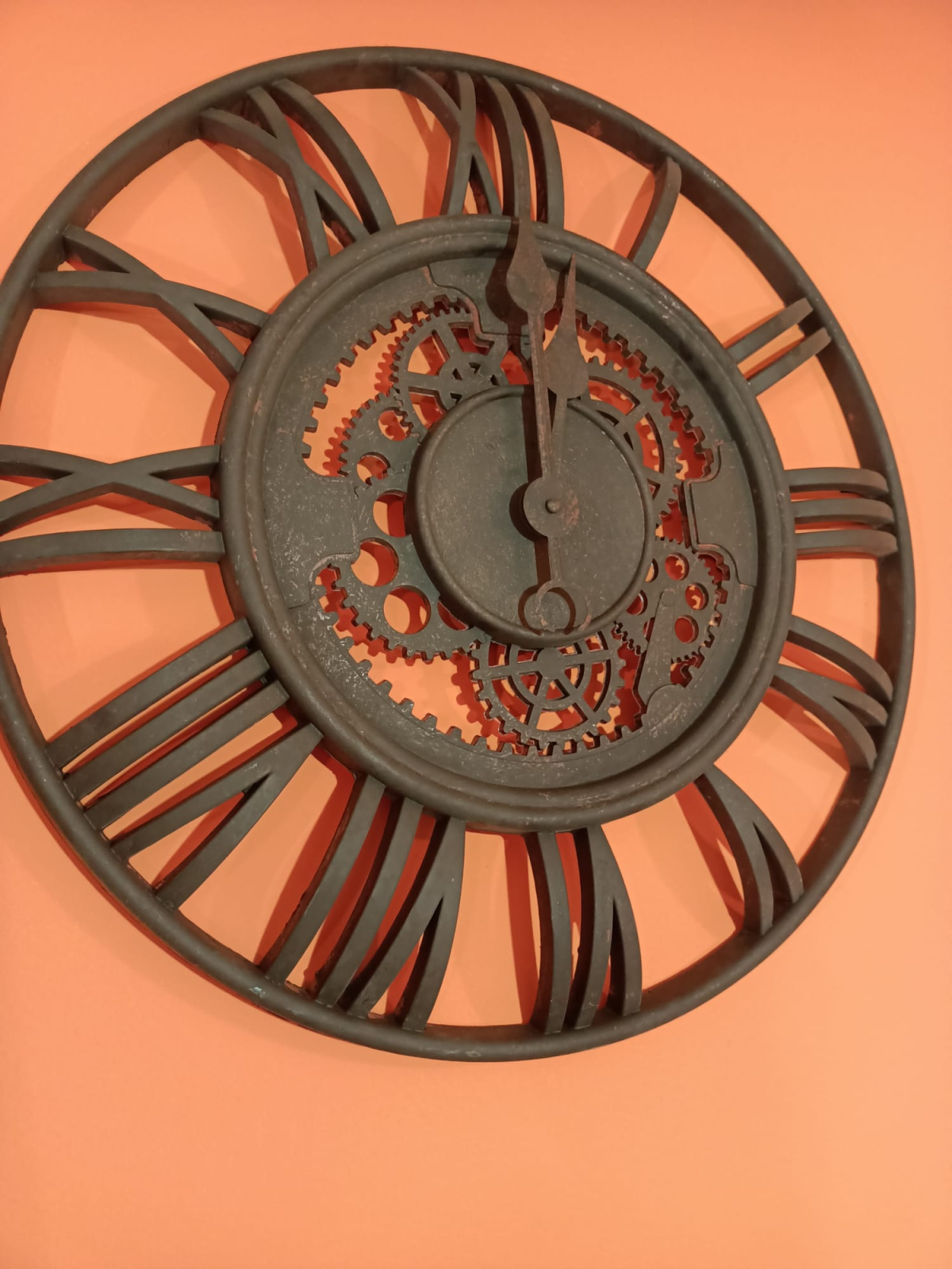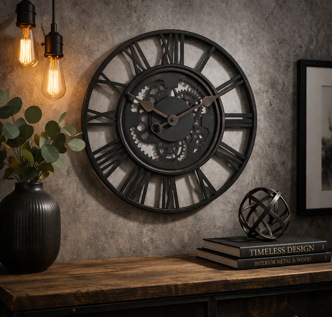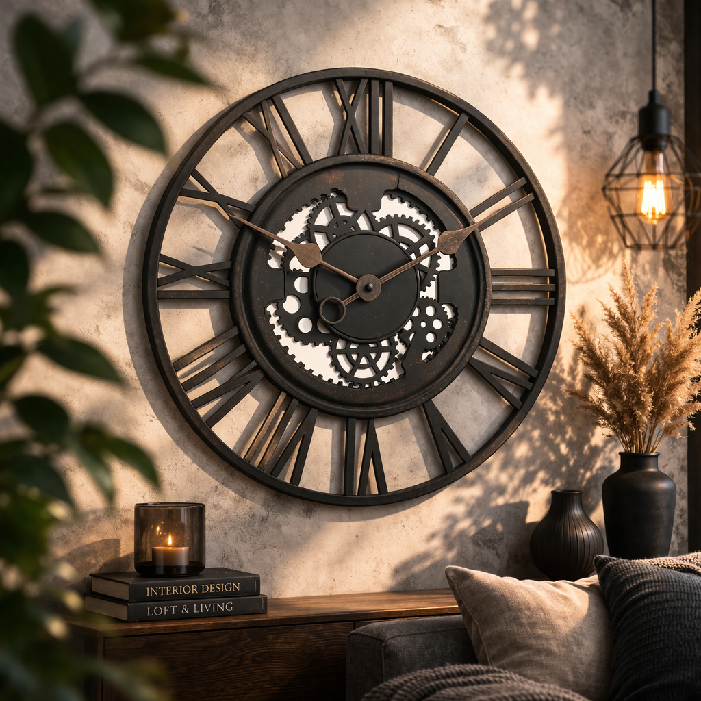 Un perete poate deveni punctul de atracție al încăperii atunci când alegi un element cu adevărat expresiv. Acest ceas reușește să capteze atenția prin designul său deschis, unde cifrele romane și detaliile inspirate din mecanismele clasice creează un joc vizual plin de caracter.