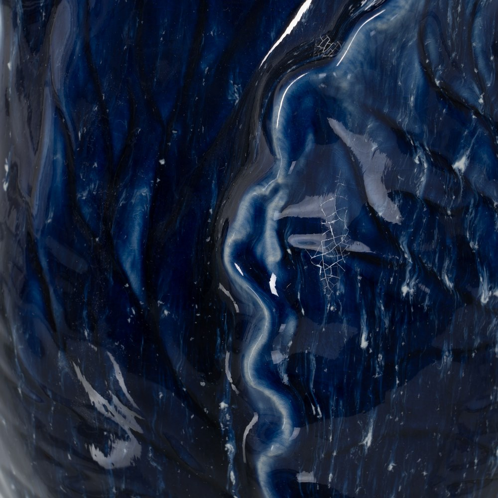 Vază decorativă din ceramică de culoare albastră, având dimensiunile 21 X 21 X 27 cm și un diametru de 16 cm la deschidere. Această piesă se distinge prin forma sa ondulată, ce amintește de valurile mării sau de petalele unei flori înflorite, oferind un efect vizual dramatic și sofisticat. Suprafața lucioasă și textura complexă contribuie la un aspect artistic, ideal pentru a aduce un accent decorativ într-un ambient modern sau eclectic.