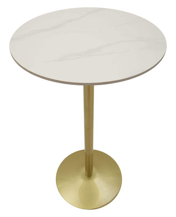 Masă înaltă de bar cu blat rotund din marmură artificială albă și bază centrală metalică aurie design elegant 60 x 103 cm