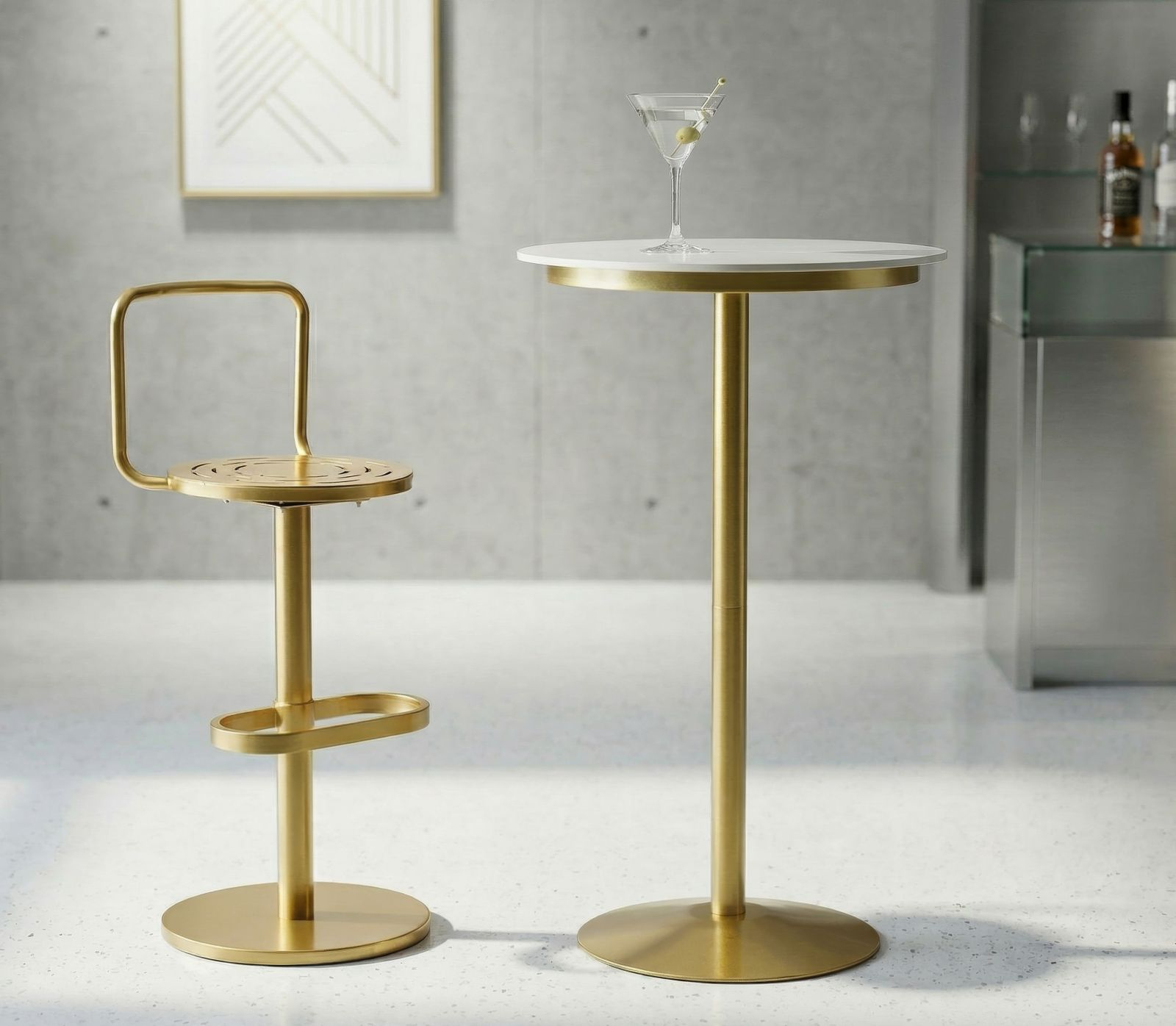 Sfatul designerului CreativDeco: Asortează masa cu scaune de bar cu detalii aurii sau tapițerie în tonuri neutre pentru a crea un colț de bar elegant și armonios.