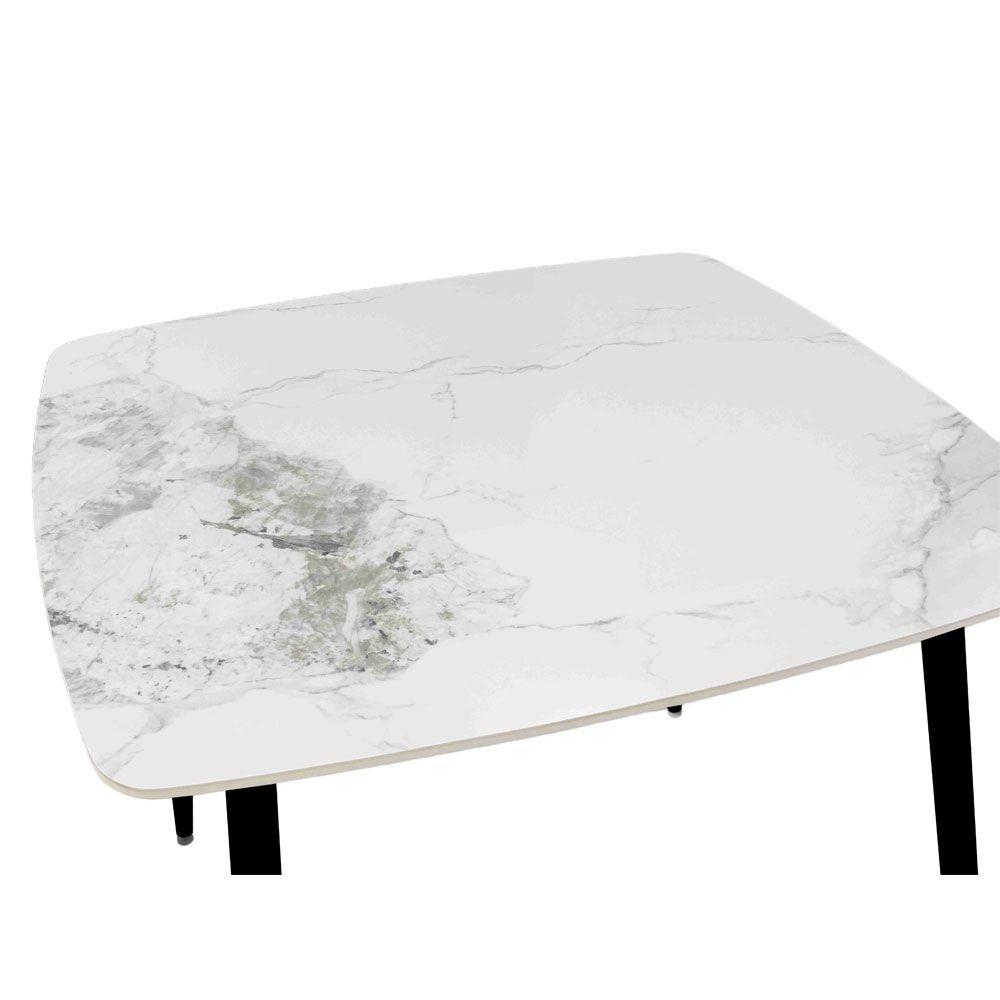 Blatul ceramic cu efect marmorat imită perfect textura pietrei naturale, fiind în același timp ușor de curățat, rezistent la pete și zgârieturi. Picioarele metalice subțiri, vopsite în negru, creează un contrast vizual plăcut și adaugă stabilitate mesei. Forma pătrată este ideală pentru 2–4 persoane și se potrivește în spații compacte, fără a încărca vizual.