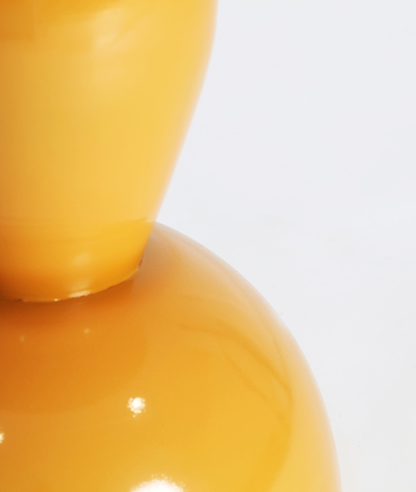 Această masă de dining atrage instant atenția datorită bazei sculpturale din fier, finisată într-un ocru lucios ce aduce energie și dinamism în încăpere. Silueta curbată și volumetrică oferă un aspect modern, jucăuș, în timp ce blatul din lemn de mango echilibrează compoziția prin tonurile sale naturale și calde.