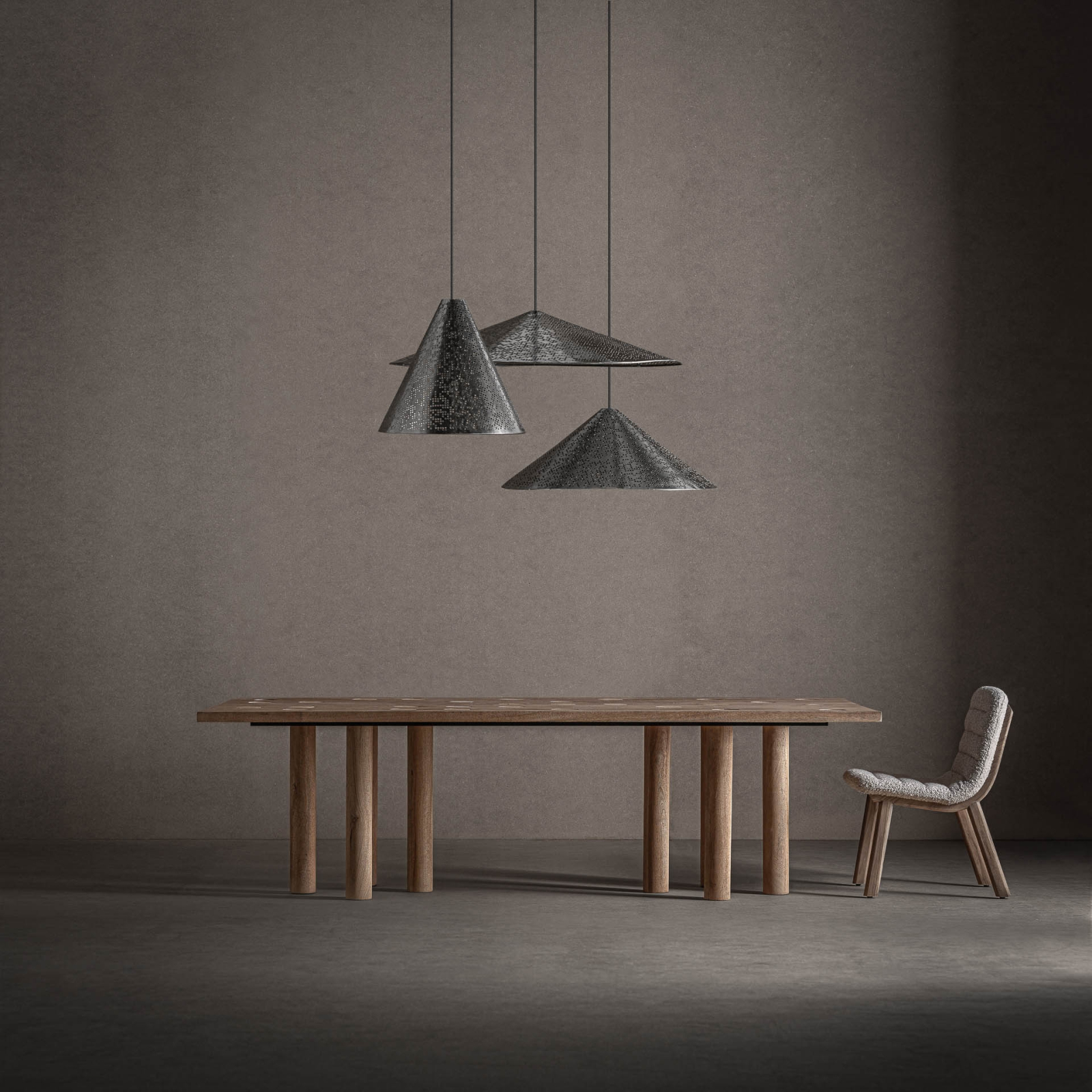 Conceptul colecției Jacquard: Colecția Jacquard își are originea în limbajul grafic al războiului de țesut Jacquard, unde repetiția și structura devin expresie vizuală. Această idee este reinterpretată în mobilier prin ritmuri perforate, contraste de materiale și volume bine definite. Lemnul, piatra și formele sculpturale se îmbină pentru a crea piese cu identitate puternică, în care tehnica se transformă în emoție și design.