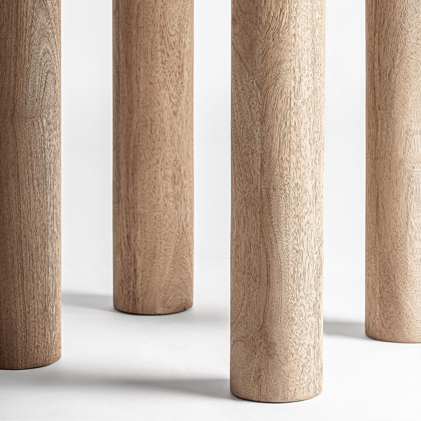 Structura mesei este susținută de picioare cilindrice din lemn de mango, dispuse într-o compoziție sculpturală ce oferă stabilitate și caracter. Designul său arhitectural îmbină robustețea cu eleganța, rezultând o masă potrivită atât pentru interioare contemporane sofisticate, cât și pentru spații cu accente naturale sau artistice.