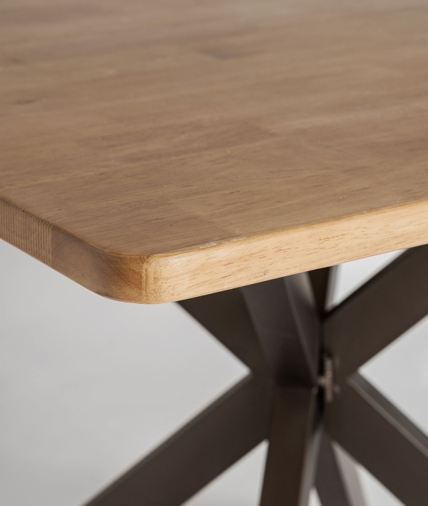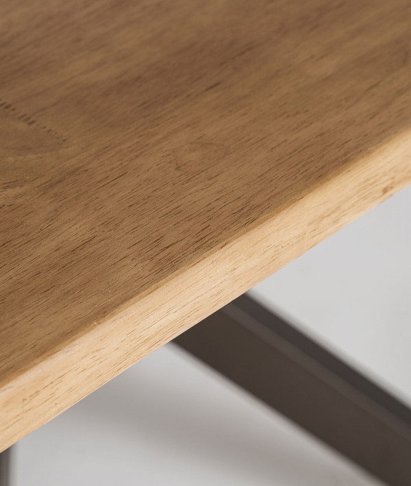 Lucens Ferrona aduce un echilibru perfect între robustețe și design. Blatul din lemn cu finisaj cald conferă un aer natural și prietenos, în timp ce baza metalică neagră adaugă un caracter industrial și modern. Forma picioarelor încrucișate nu doar asigură stabilitate, ci și un detaliu vizual de impact.