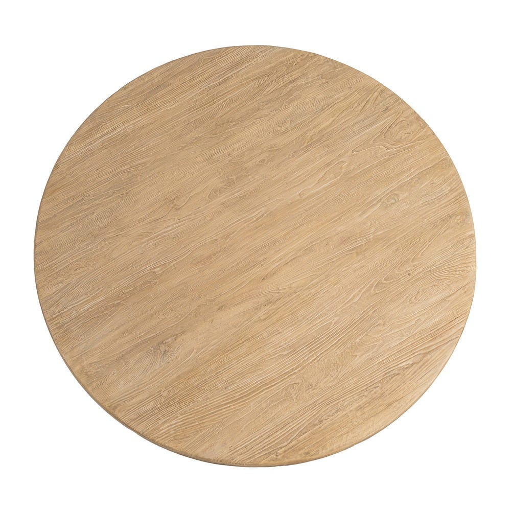 Această masă de dining impresionează printr-un design sculptural și echilibrat, realizată integral din lemn de ulm reciclat. Blatul rotund, cu margini fin rotunjite și grosime generoasă, evidențiază textura naturală a lemnului și oferă o prezență solidă, dar elegantă.