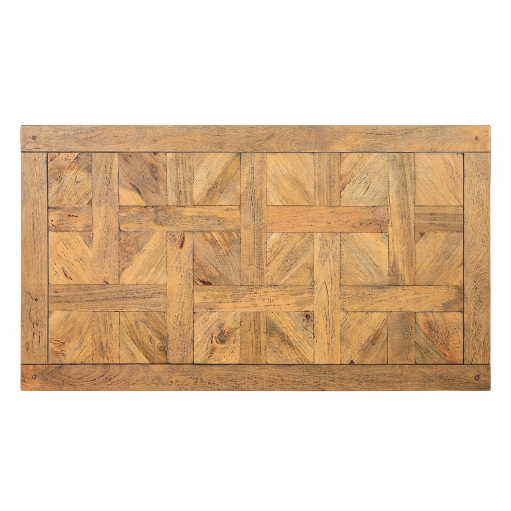 Masa de dining cu blat din lemn de mango pentru 6 persoane, elegantă și robustă, cu un model geometric sofisticat, ideală pentru un decor modern și stilat în orice spațiu de dining sau bucatarie.
