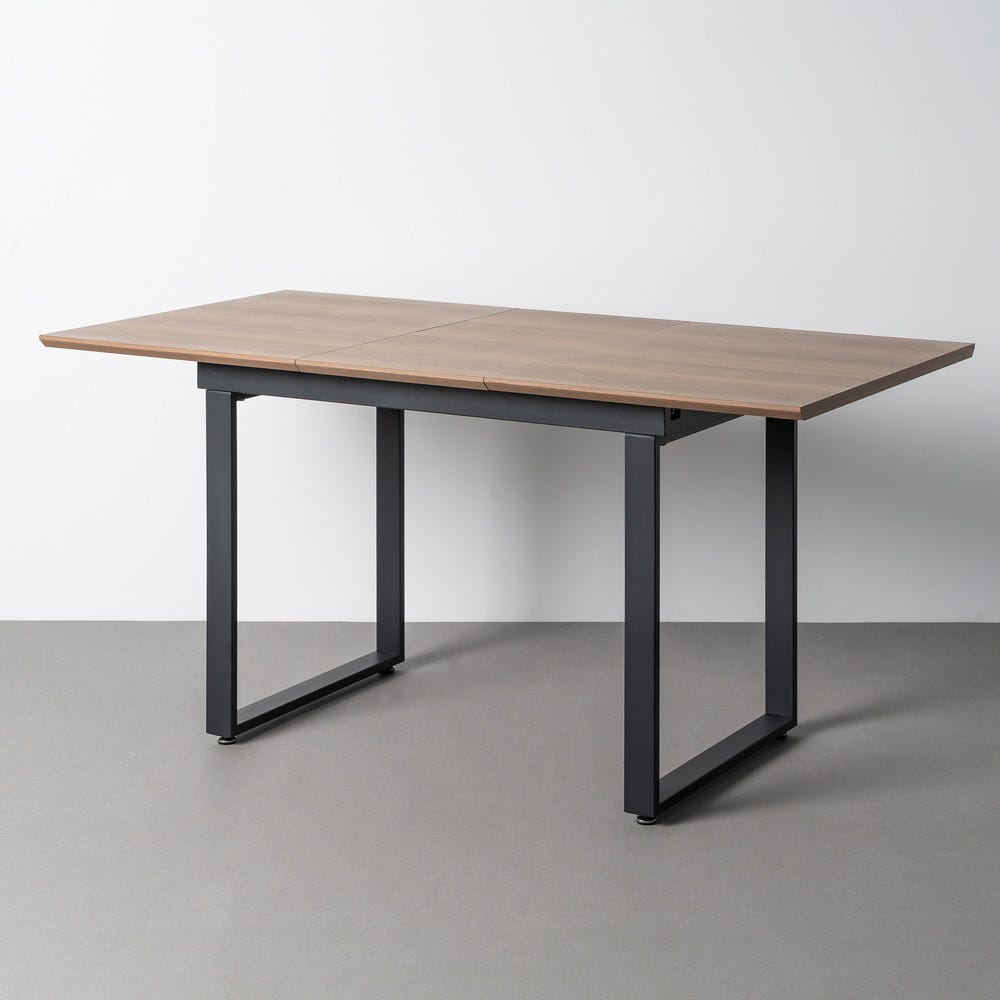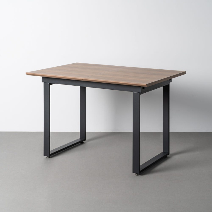 Masă extensibilă cu blat maro din mdf și structură metalică neagră din fier, potrivită pentru bucătărie sau dining amenajat în stil modern. Contrastul dintre blatul maro și cadrul metalic negru oferă un aspect echilibrat și ușor de integrat în spații contemporane.