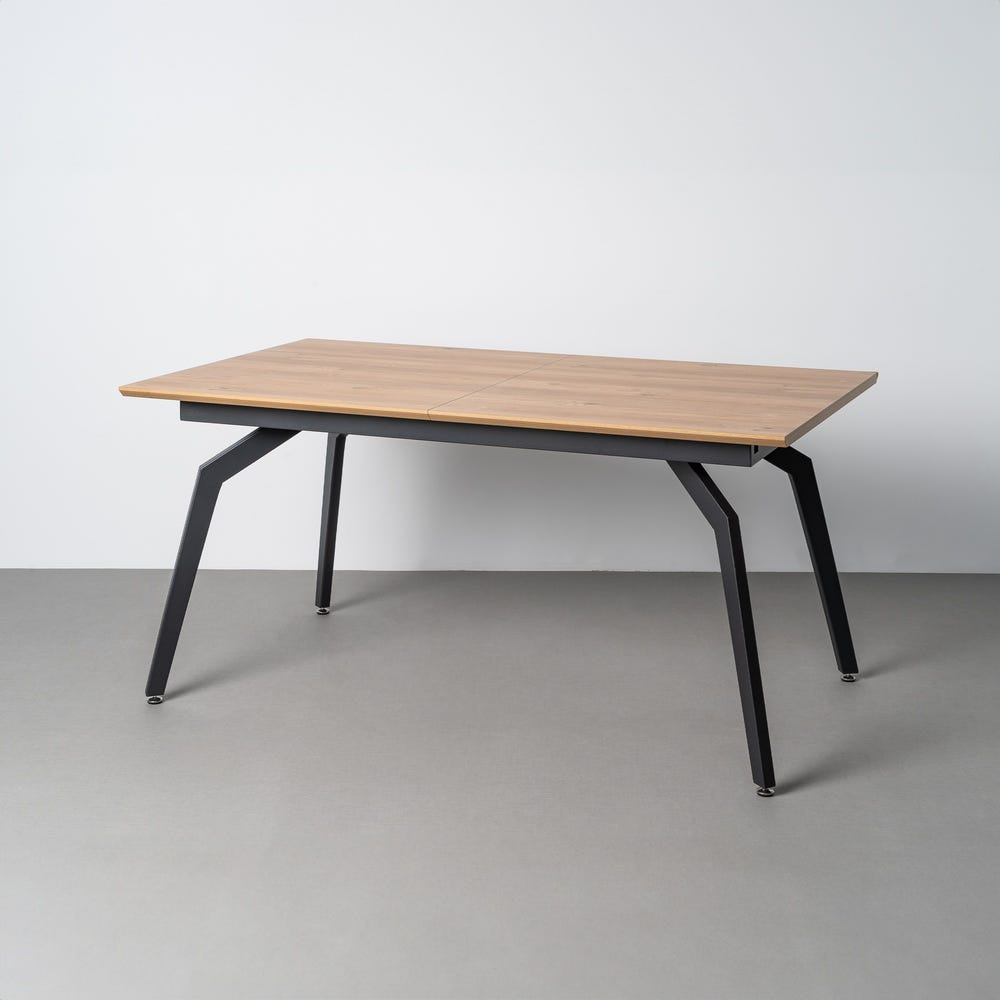 Masă extensibilă cu blat maro din mdf și structură metalică neagră din fier, potrivită pentru dining sau bucătărie amenajată în stil modern. Contrastul dintre blatul maro și baza metalică neagră oferă un aspect echilibrat și actual.