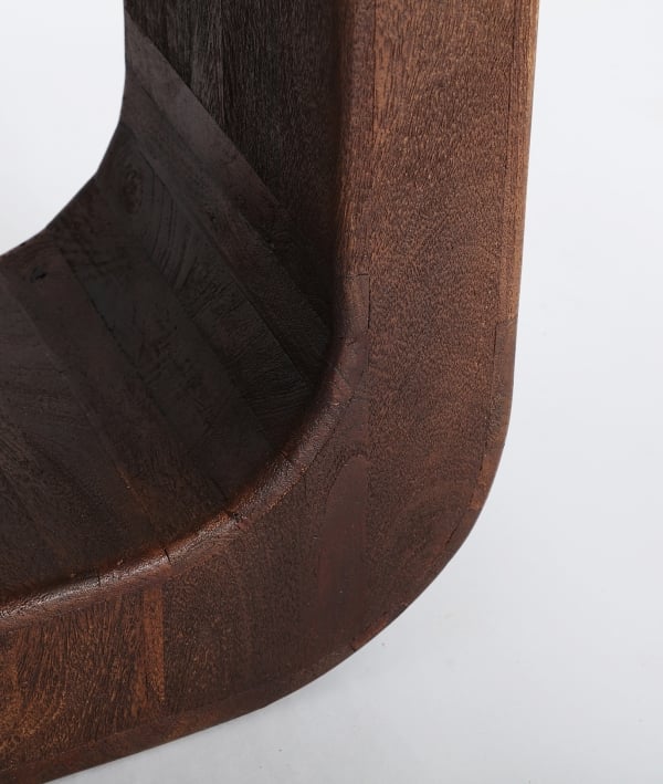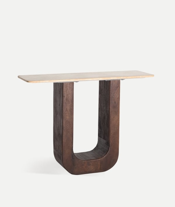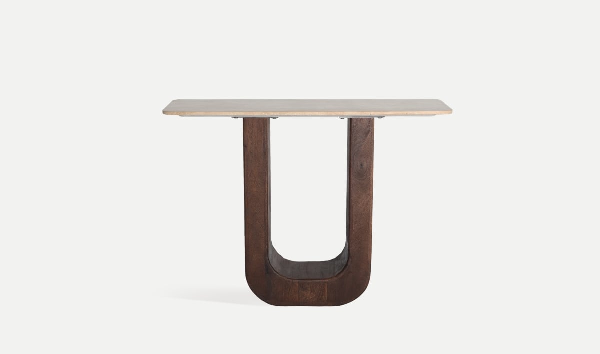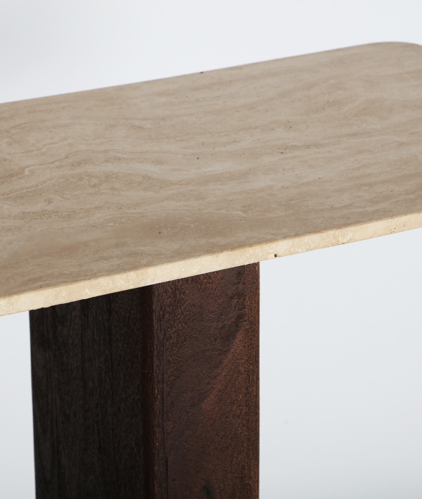LOOP aduce un plus de rafinament prin contrastul subtil dintre tonurile calde ale lemnului de mango și suprafața netedă, luminoasă a marmurei bej. Baza sculpturală în formă de arc oferă stabilitate și eleganță, transformând consola într-un punct de atracție al oricărui hol, living sau spațiu de recepție.