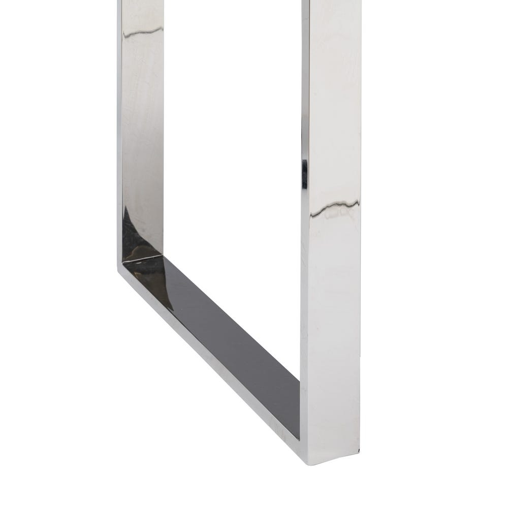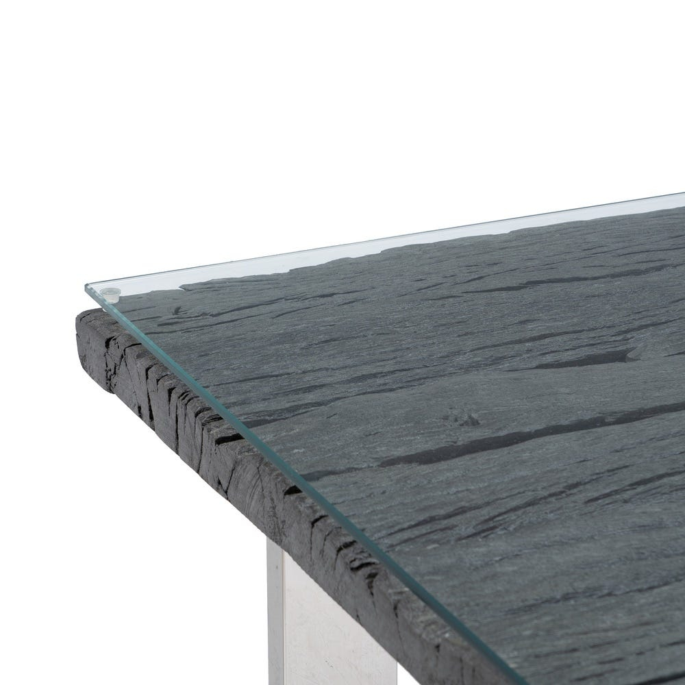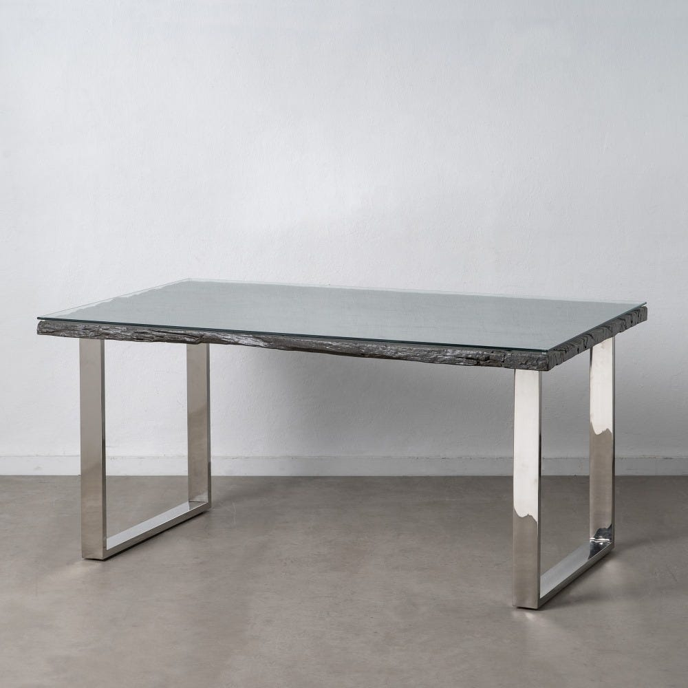 Blatul cu margini neregulate pastreaza frumusetea organica a lemnului, adaugand autenticitate si rafinament brut. Suprafata de sticla transparenta amplifica luminozitatea spatiului si evidentiaza textura profunda a stratului de lemn. Structura metalica din otel inoxidabil, cu picioare masive si finisaj oglinda, creeaza un efect vizual sculptural, dar si o stabilitate excelenta.