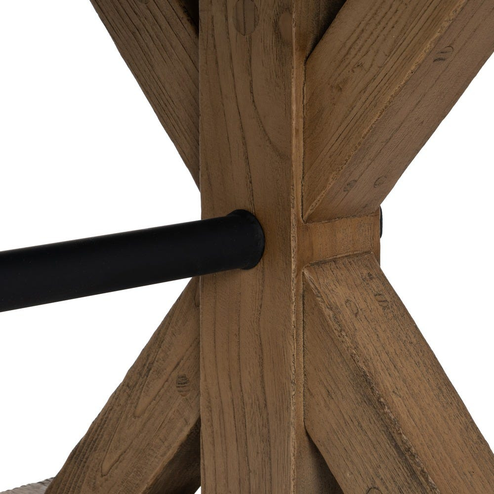 Masă de dining din lemn de stejar recuperat cu picioare în X și bară metalică, în stil rustic industrial, ideală pentru spații ample și autentice.