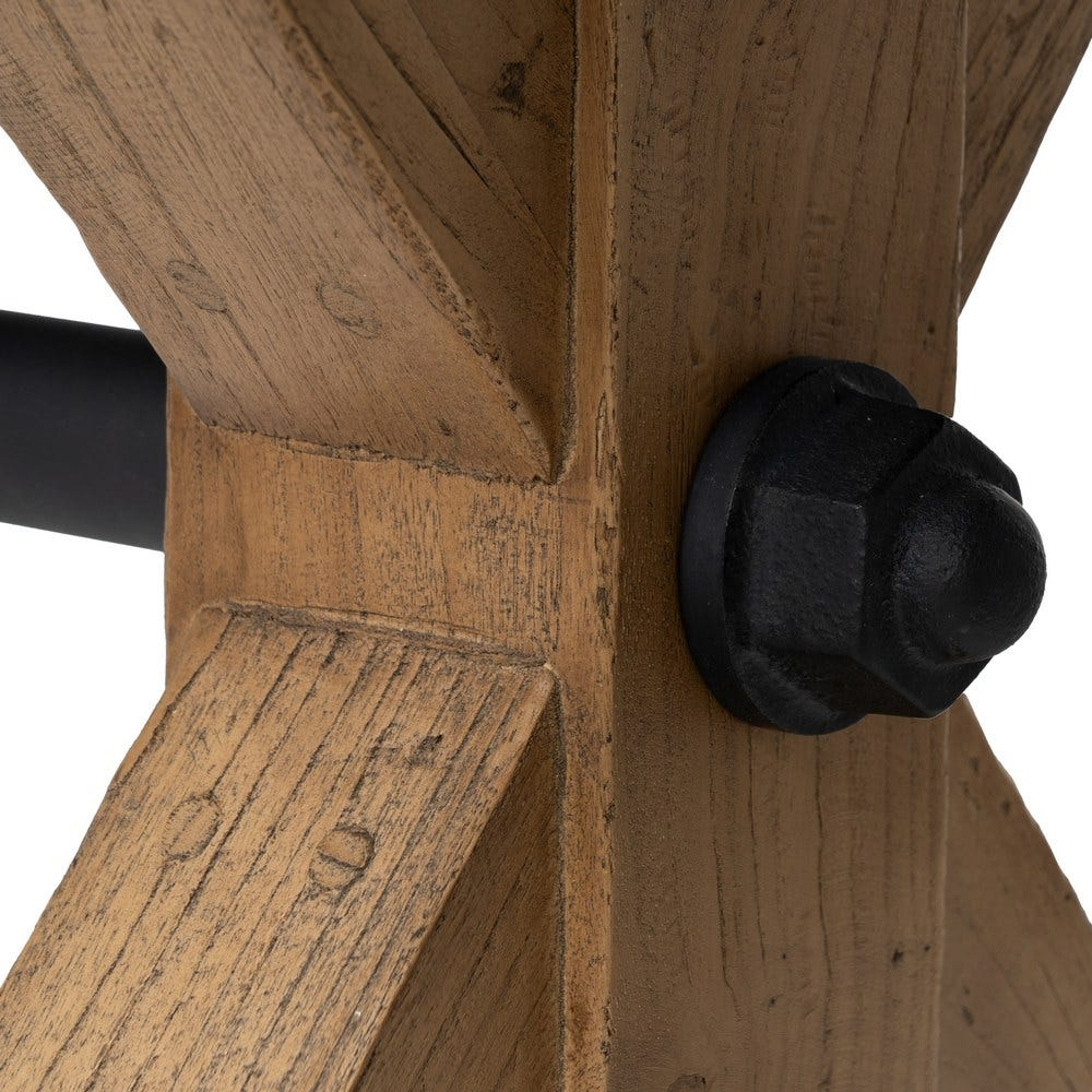 Material: blat gros de 3,5 cm din lemn de stejar recuperat, structură solidă cu picioare în X și bară metalică transversală