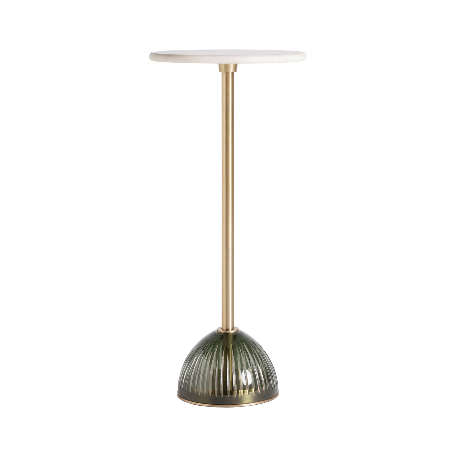 Masă laterală Murano cu bază din sticlă verde smarald, structură aurie și blat din marmură albă, design vertical sofisticat.