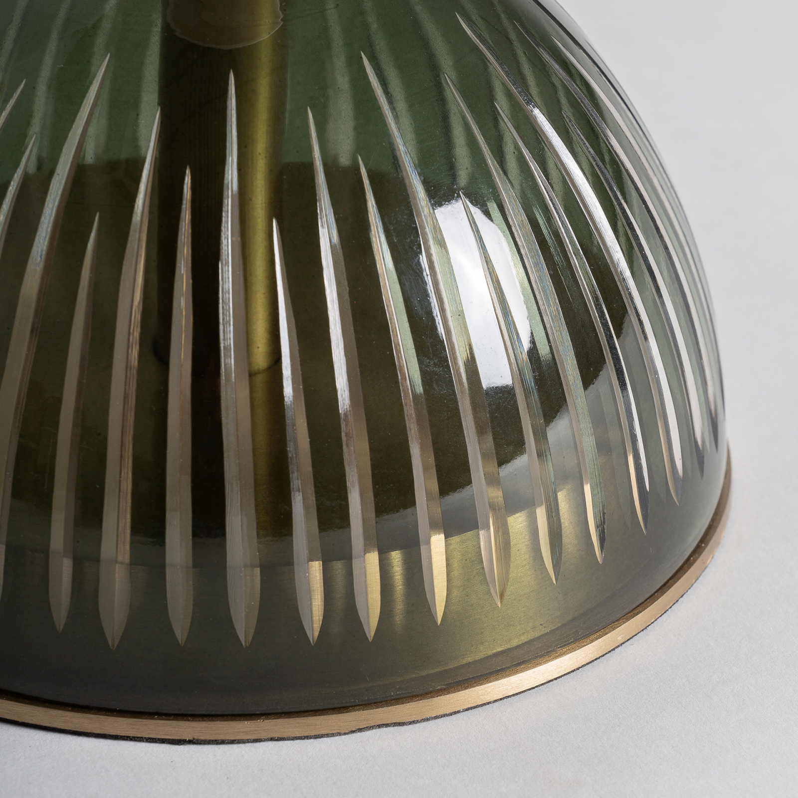 ✔ Bază din sticlă verde suflată – transparență sculpturală cu textură radială