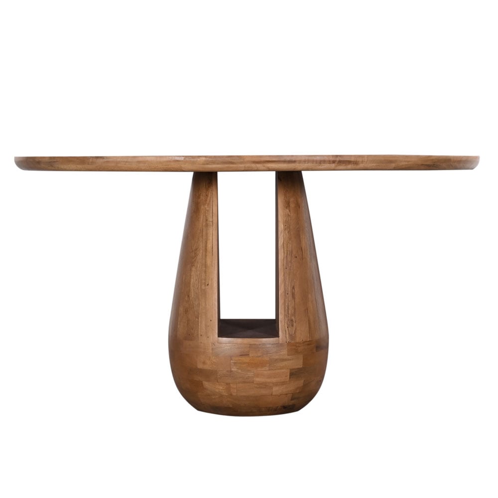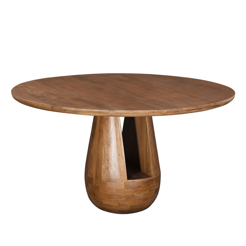 Blatul spațios cu diametrul de 140 cm oferă loc suficient pentru până la 6 persoane, iar baza sculpturală adaugă un element de design aparte, fără a compromite stabilitatea. Nuanța caldă de lemn natural creează o atmosferă primitoare și rafinată, potrivită atât pentru interioare moderne, cât și pentru cele cu accente rustice sau boeme.