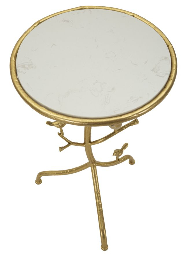 Masuta Birds este o declaratie poetica in design – o piesa decorativa si functionala cu un farmec aparte, inspirata din natura si reinterpretata intr-o estetica glam delicata. Structura aurie este sculptata in forma unui trunchi de copac stilizat, cu ramuri fine pe care stau trei pasari, elemente decorative care adauga expresivitate si tandrete. Blatul rotund, din marmura alba, creeaza un contrast elegant cu suportul organic, conferind un plus de rafinament si lux discret.
