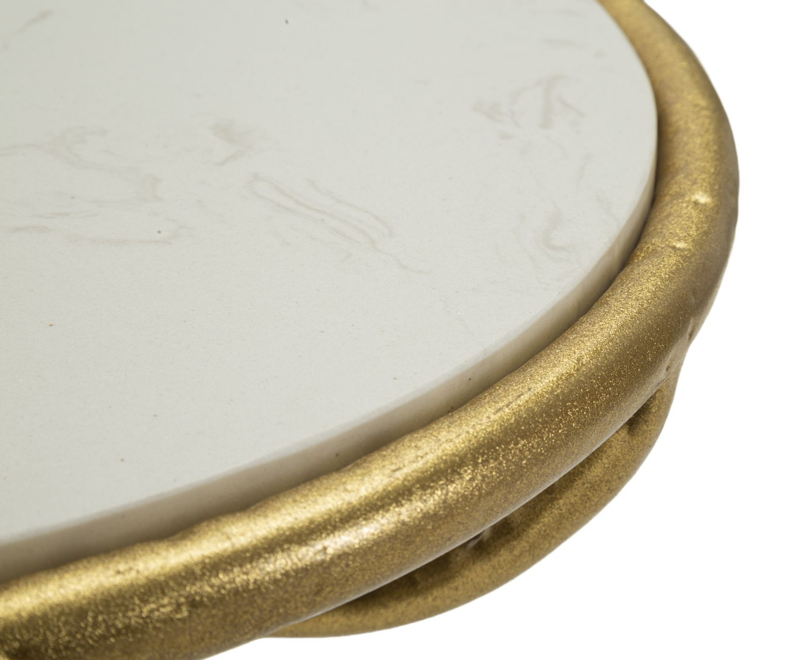 Dimensiuni: 38 x 60 cm | Greutate: 4.7 kg | Materiale: structura metalica finisata auriu, blat din marmura naturala | Nu necesita montaj | Utilizare decorativa sau functionala