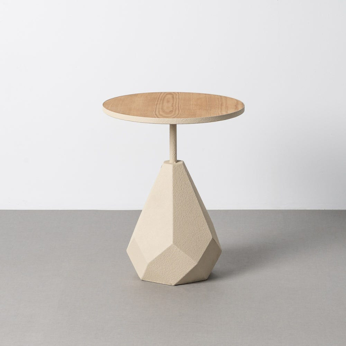 Această măsuță laterală se remarcă printr-un design geometric sculptural, în care baza fațetată devine elementul definitoriu al piesei. Contrastul dintre blatul rotund cu aspect natural și structura metalică crem creează o compoziție echilibrată, potrivită pentru interioare contemporane cu accent pe forme expresive și detalii de design.