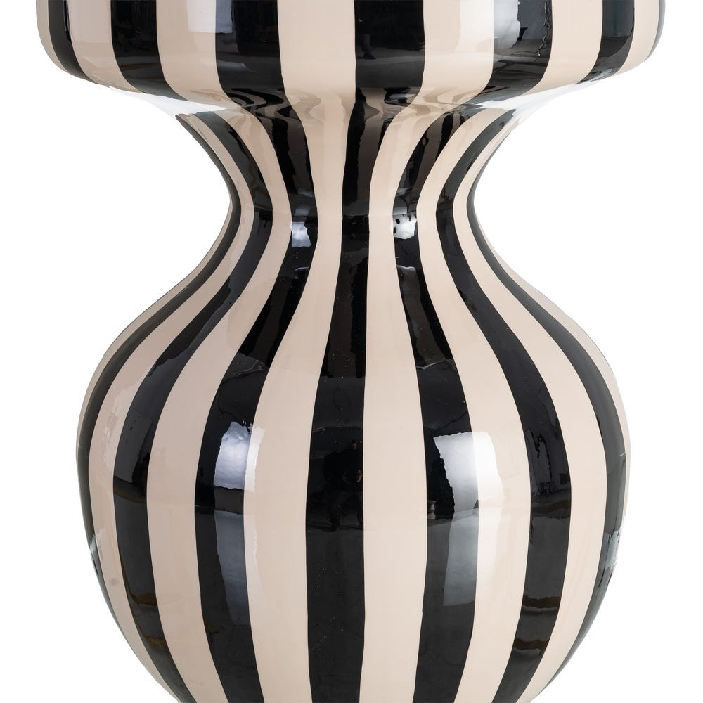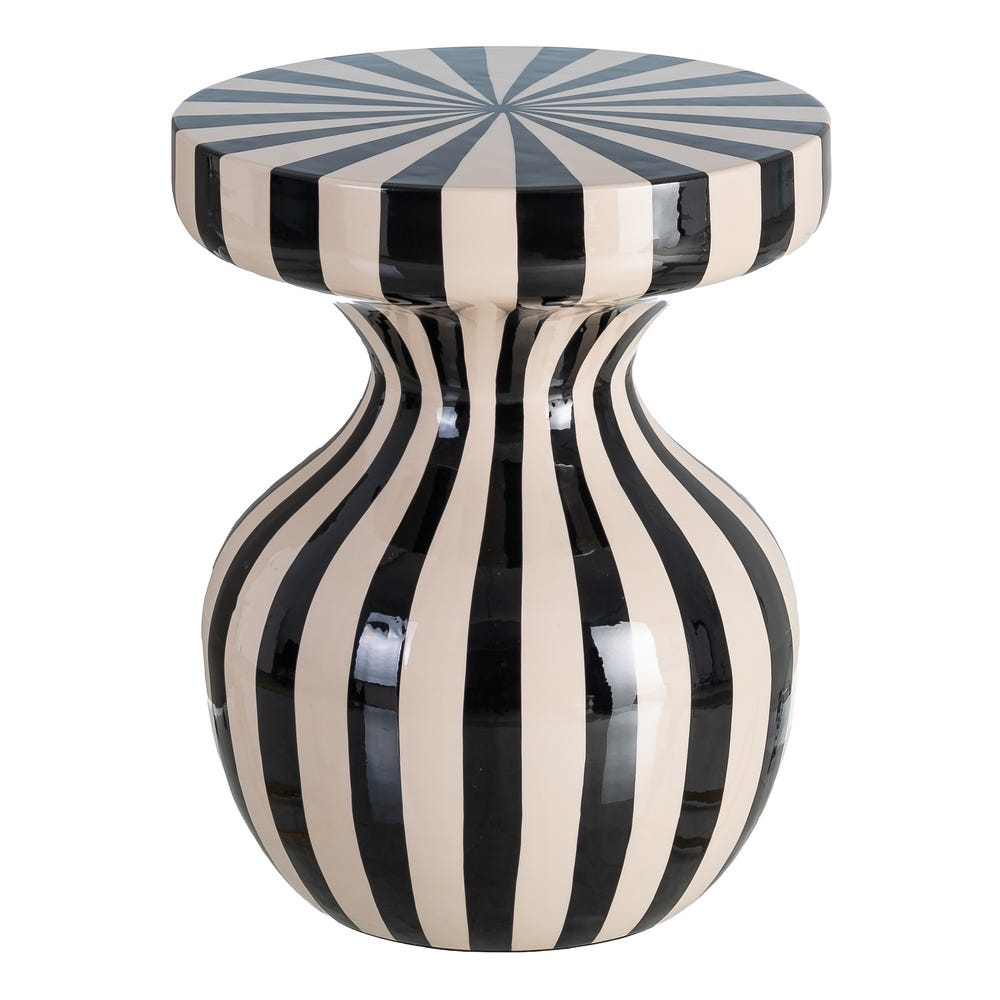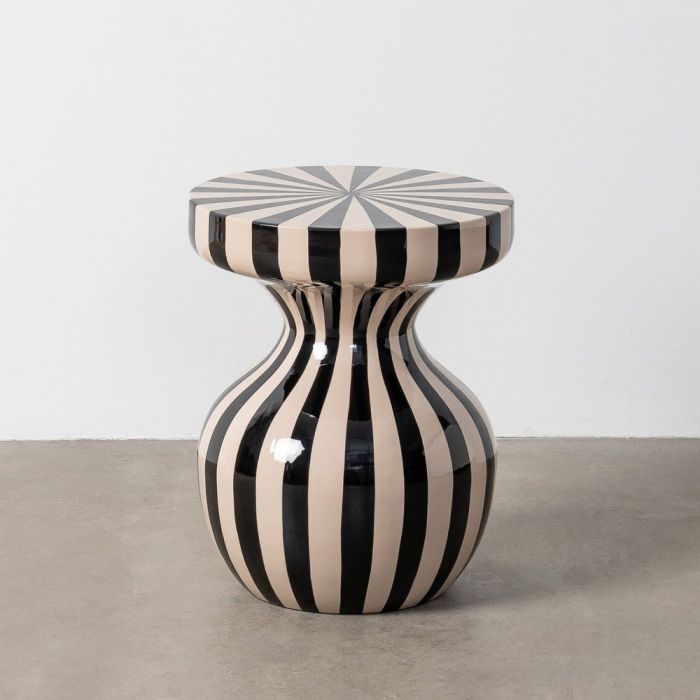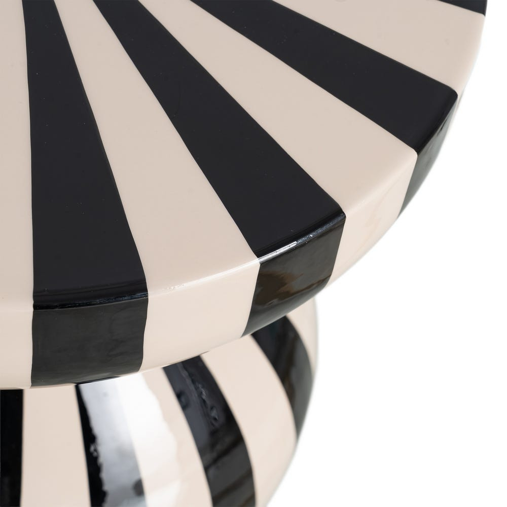 Această măsuță laterală se evidențiază printr-un design grafic puternic, bazat pe contrastul alb-negru și pe un joc dinamic de linii verticale. Forma sa sculpturală, cu bază rotunjită și blat circular accentuat, transformă piesa într-un obiect decorativ statement, potrivit pentru interioare moderne sau eclectic-contemporane.