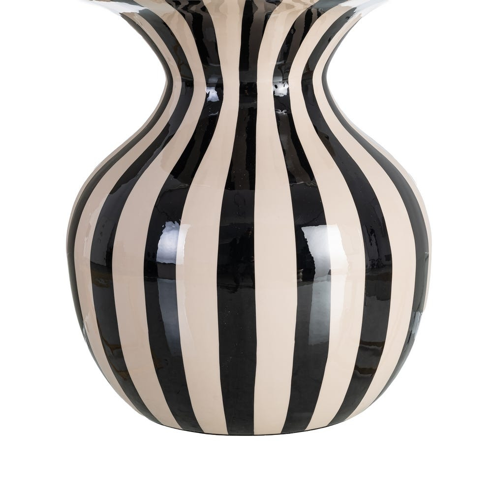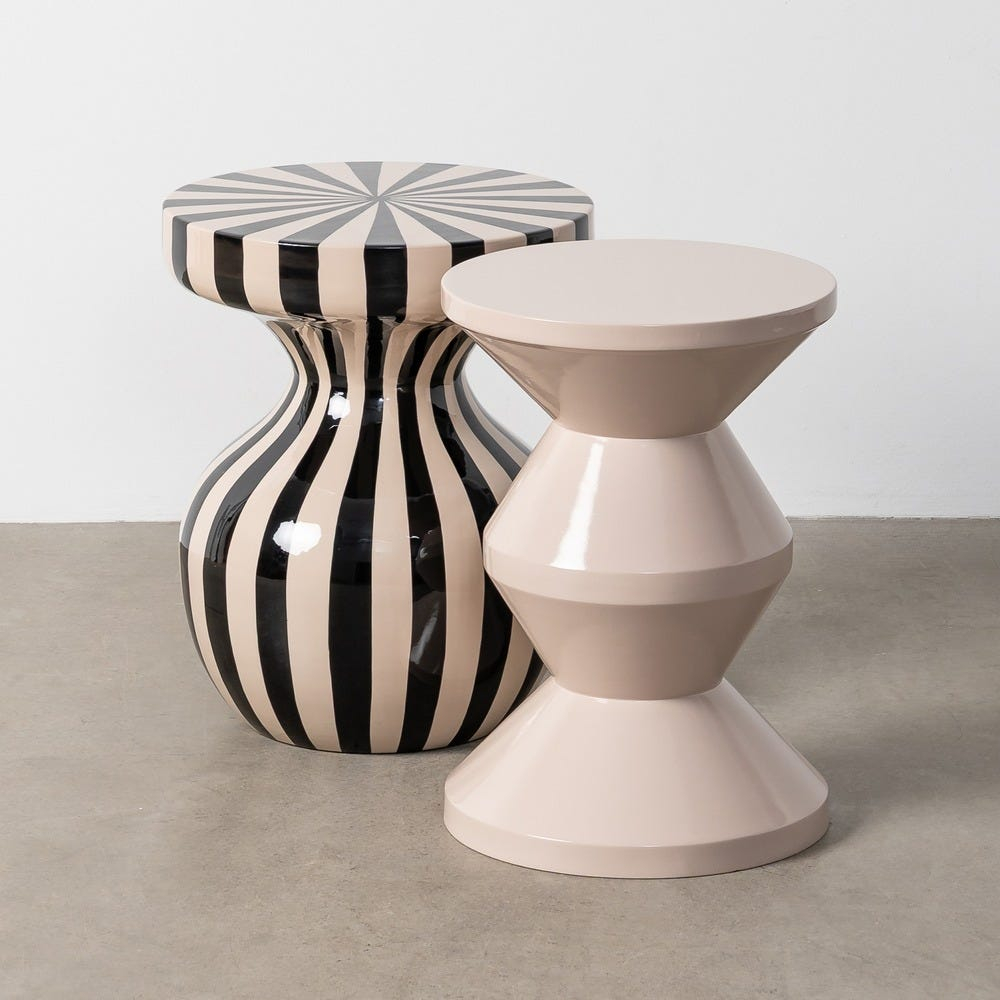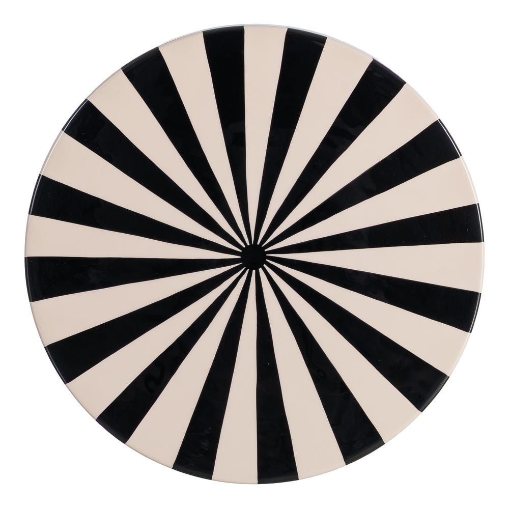 Această măsuță laterală se evidențiază printr-un design grafic puternic, bazat pe contrastul alb-negru și pe un joc dinamic de linii verticale. Forma sa sculpturală, cu bază rotunjită și blat circular accentuat, transformă piesa într-un obiect decorativ statement, potrivit pentru interioare moderne sau eclectic-contemporane.