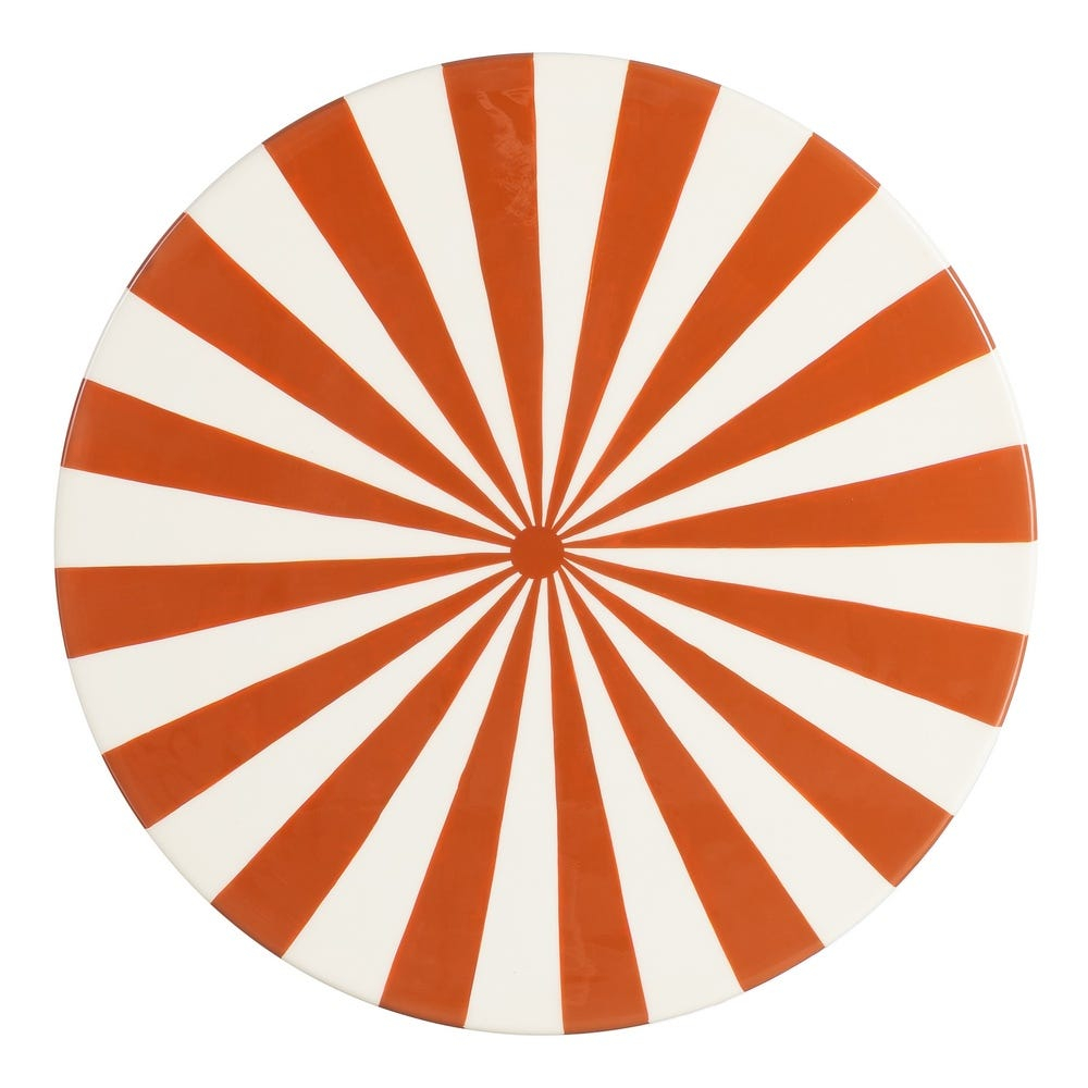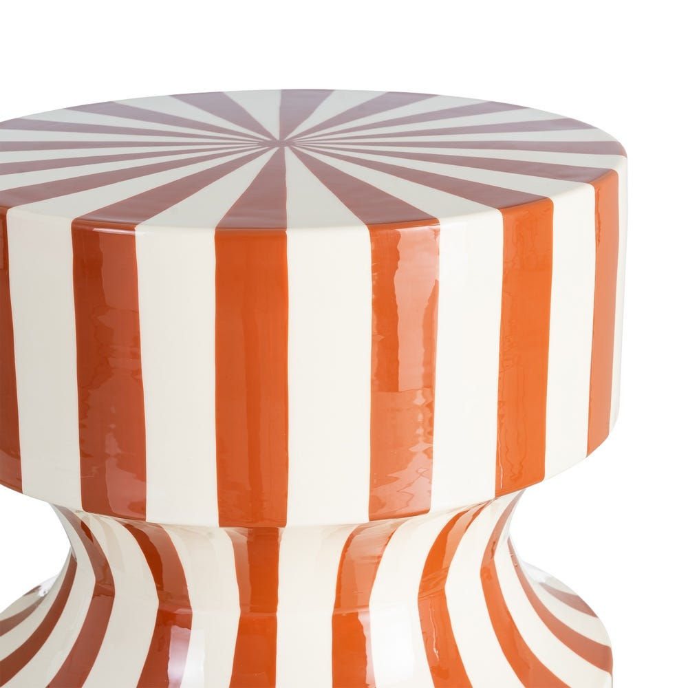 Această măsuță laterală se remarcă printr-un design grafic expresiv, definit de dungi verticale în nuanțe terracotta și alb. Forma sa compactă, cu volum central curbat și blat circular accentuat, transformă piesa într-un obiect decorativ statement, potrivit pentru interioare contemporane.