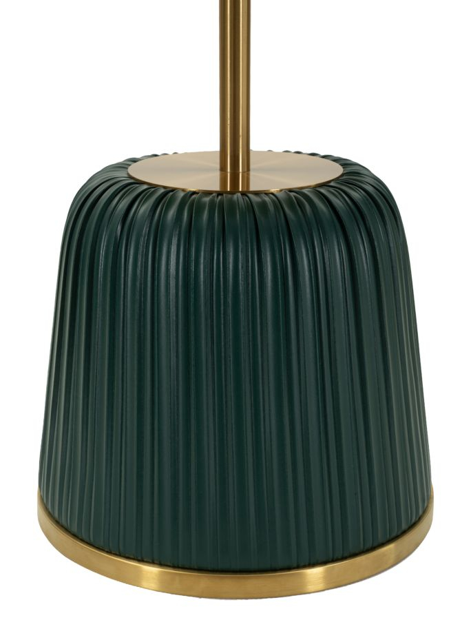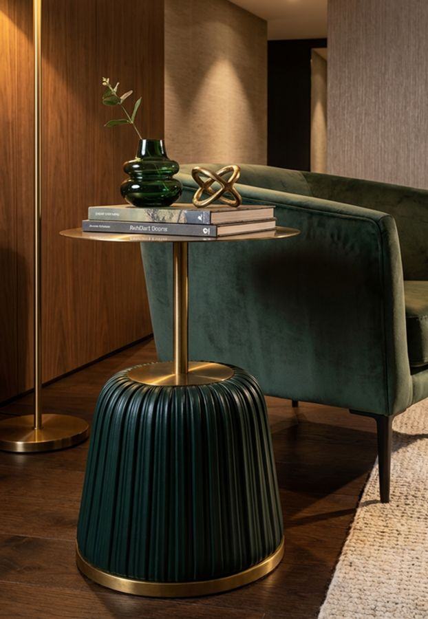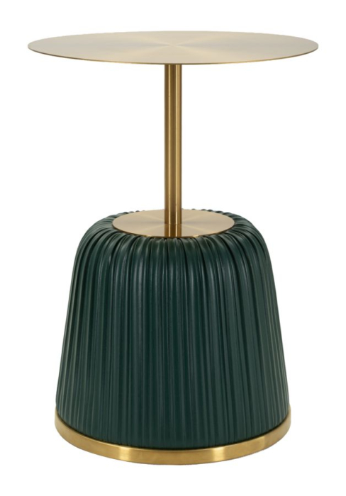 Blatul rotund din metal cu finisaj auriu reflectă subtil lumina și adaugă un aer prețios încăperii, în timp ce baza verde cu textură plisată oferă volum și personalitate. Forma echilibrată și proporțiile armonioase transformă această măsuță într-un accent decorativ cu impact vizual elegant.