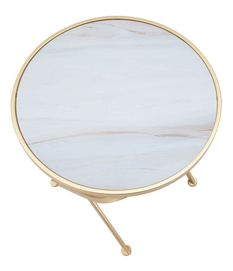 Măsuță laterală rotundă Glam cu blat de sticlă marmorată. Adaugă rafinament în living modern sau dormitor elegant.