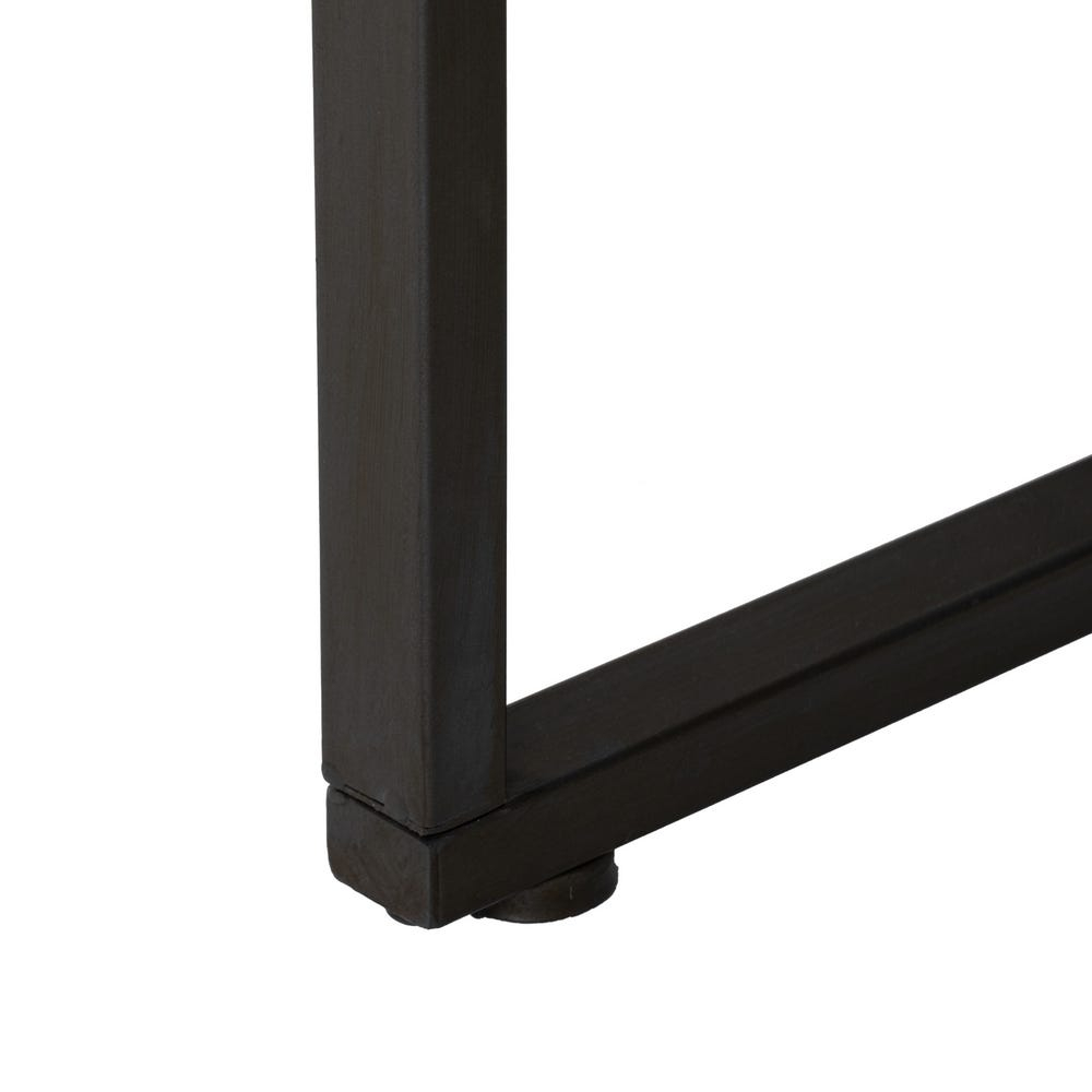 Structura este susținută de un cadru metalic negru cu picioare în formă geometrică, care adaugă stabilitate și un aspect aerisit. Blatul transparent permite luminii să circule și creează senzația de spațiu deschis, în timp ce textura lemnului adaugă căldură decorului.