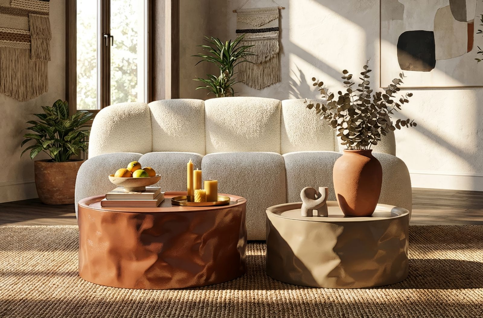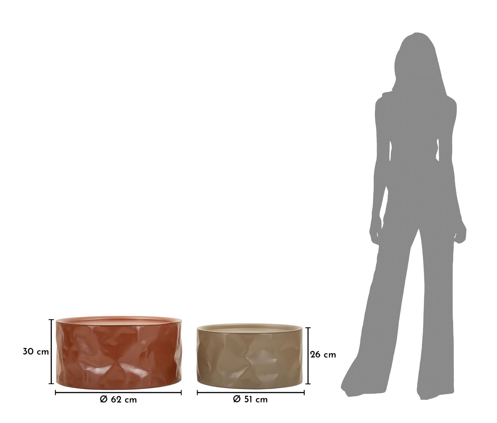 Setul Norimberga este compus din două măsuțe de cafea metalice cu formă rotundă și proporții echilibrate, potrivite pentru living sau pentru spații HORECA precum hoteluri, restaurante sau zone lounge elegante. Suprafața cu efect ciocănit evidențiază materialitatea metalului și creează reflexii subtile care animă vizual ambientul.