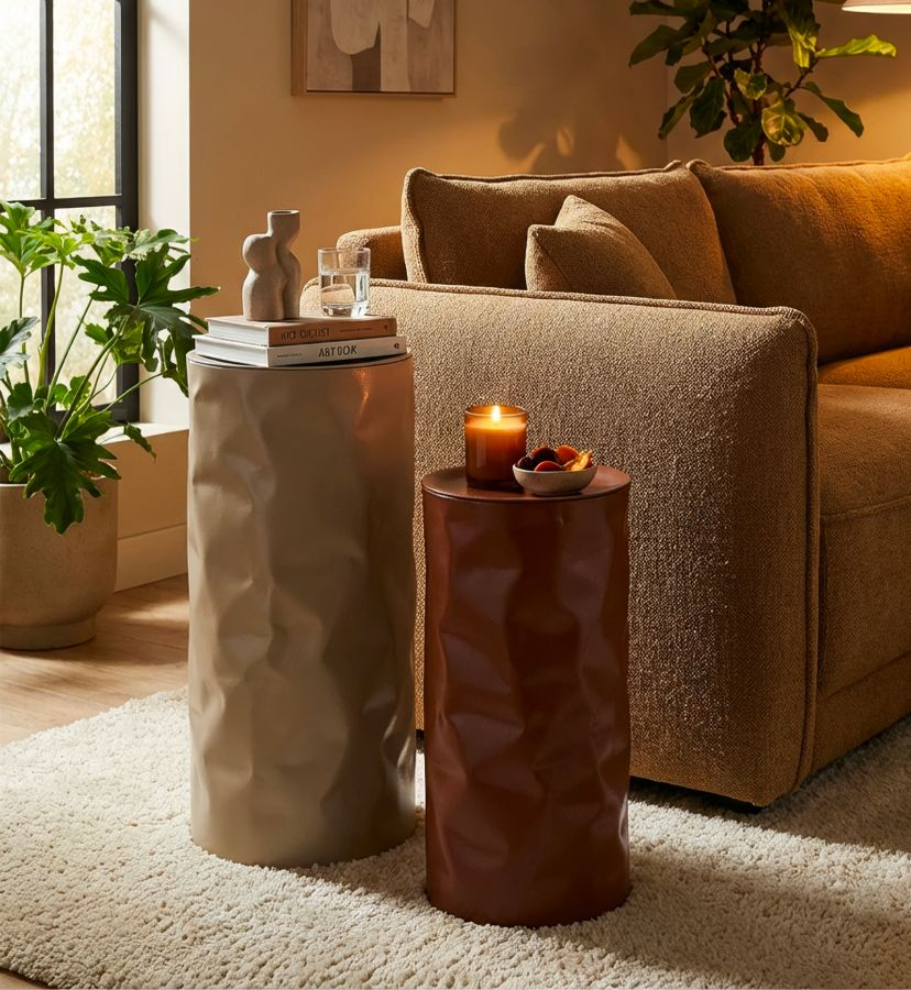 Setul Norimberga este compus din două măsuțe laterale metalice cu siluetă suplă și prezență sculpturală, potrivite pentru living sau pentru spații HORECA precum hoteluri, restaurante sau zone lounge sofisticate. Designul cilindric și suprafața cu efect ciocănit creează reflexii dinamice care captează lumina și adaugă profunzime vizuală ambientului.
