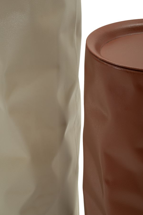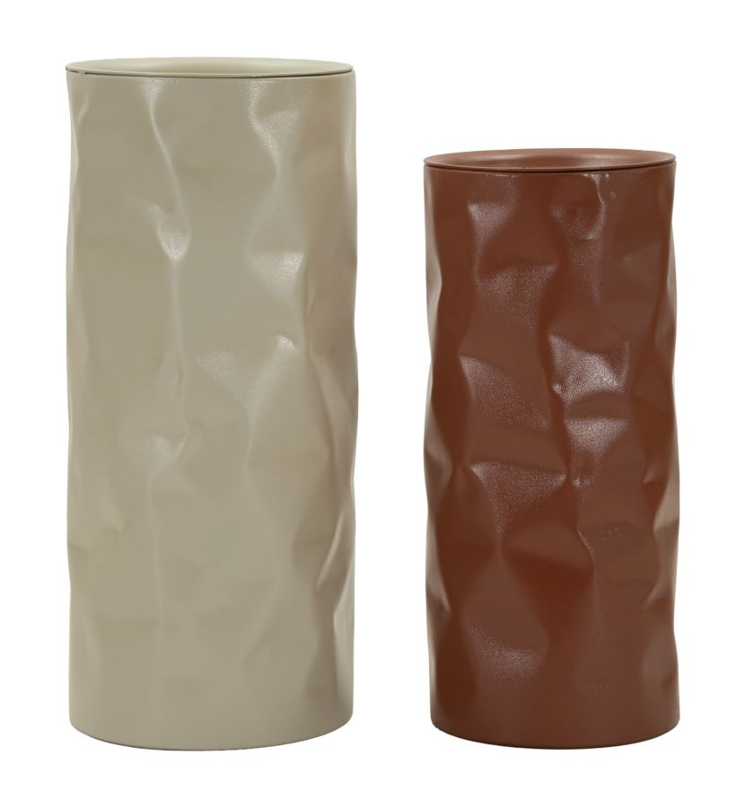 Setul 2 masute laterale metalice rosu si alb pentru living sau HORECA este un ansamblu decorativ cu silueta cilindrica si finisaj texturat. Setul poate fi utilizat impreuna sau separat, oferind suport pentru obiecte decorative in livinguri sau spatii HORECA. Contrastul cromatic si suprafata cu efect ciocanit adauga profunzime si personalitate amenajarii.