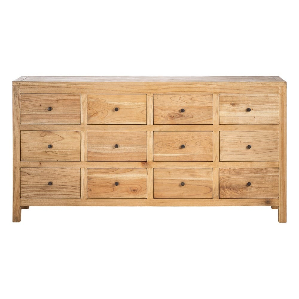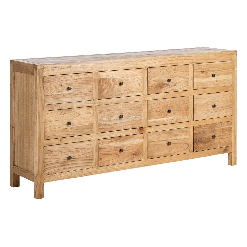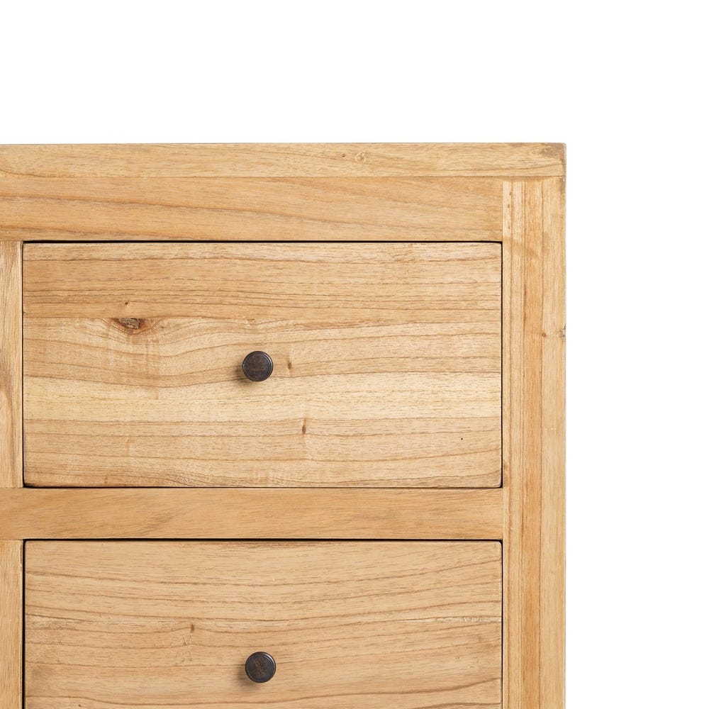 Bufet din lemn de mindi natur Mindi pentru living și dining, conceput ca piesă statement cu fațadă ritmată de sertare egale și picioare înălțate, ideal pentru depozitare elegantă și organizare rapidă.