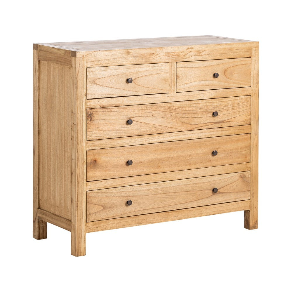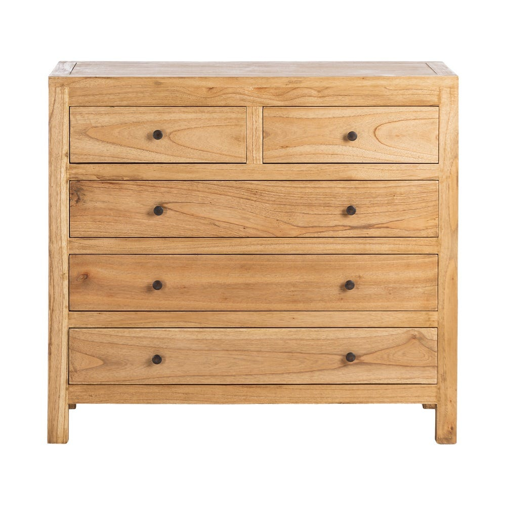 Comodă din lemn de mindi natur Mindi pentru dormitor, gândită pentru depozitare eficientă și aspect cald, cu fronturi netede și butoni rotunzi metalici ce pun în valoare fibra lemnului.