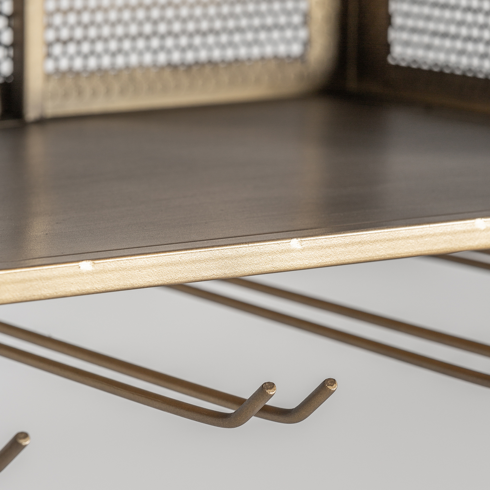 Mobilier bar din metal auriu în stil Art Deco, fabricat artizanal din fier. Cu dimensiuni de 80 cm lungime, 40 cm lățime și 28 cm înălțime, această piesă demontabilă aduce o notă de lux și eleganță în orice interior. Mobilierul bar Art Deco este renumit pentru designul său sofisticat și aspectul luxos. Finisajul auriu oferă un aspect strălucitor și rafinat. Importat de CreativDeco, acest mobilier bar de calitate spaniolă cântărește 5,3 kg, suportă aproximativ 20 kg și poate găzdui 4 pahare per aplicație. Este ideal pentru a crea un punct focal elegant în living sau zona de dining, aducând un touch de glamour interbelic în casa dumneavoastră.