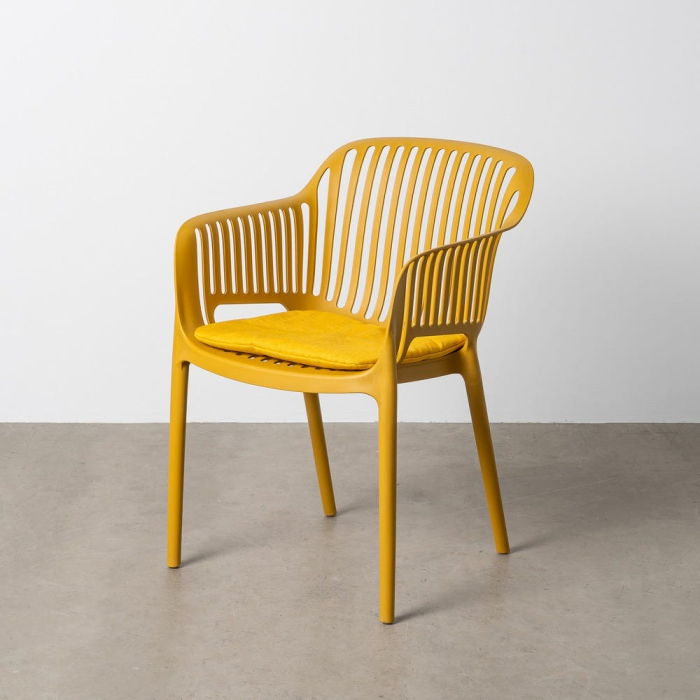 Acest set de scaune pentru exterior este conceput pentru spații deschise în care culoarea și funcționalitatea sunt esențiale. Nuanța muștar, combinată cu forma aerisită a spătarului și brațele integrate, creează o piesă ușor de integrat în zone de dining outdoor sau terase amenajate modern.