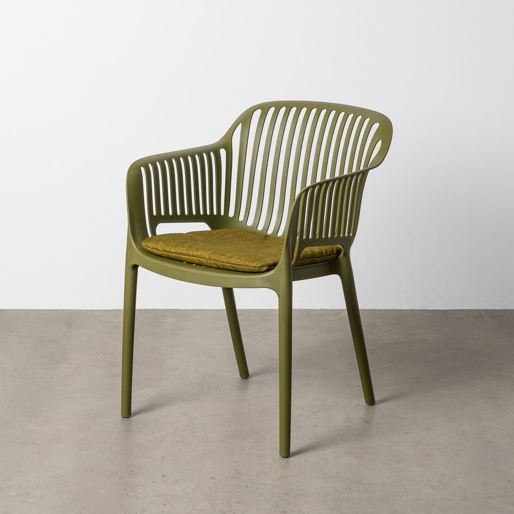 Setul de 4 scaune verzi din polipropilenă cu brațe pentru exterior este gândit pentru amenajări care urmăresc integrarea cromatică în grădină sau pe terasă. Designul deschis al spătarului păstrează un aspect aerisit și practic. Perna fixă cu țesătură rezistentă la apă completează utilizarea în exterior și confortul zilnic.