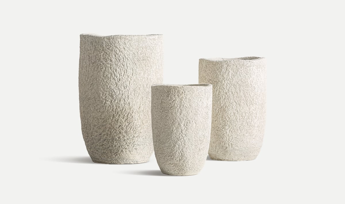 Setul include trei ghivece de dimensiuni diferite, fiecare lucrat manual pentru a păstra unicitatea materialului. Textura neregulată și tonurile subtile de alb murdar se combină pentru a crea un efect tactil rafinat și sofisticat. MASSA este alegerea ideală pentru plante decorative, arbuști sau compoziții florale de interior.