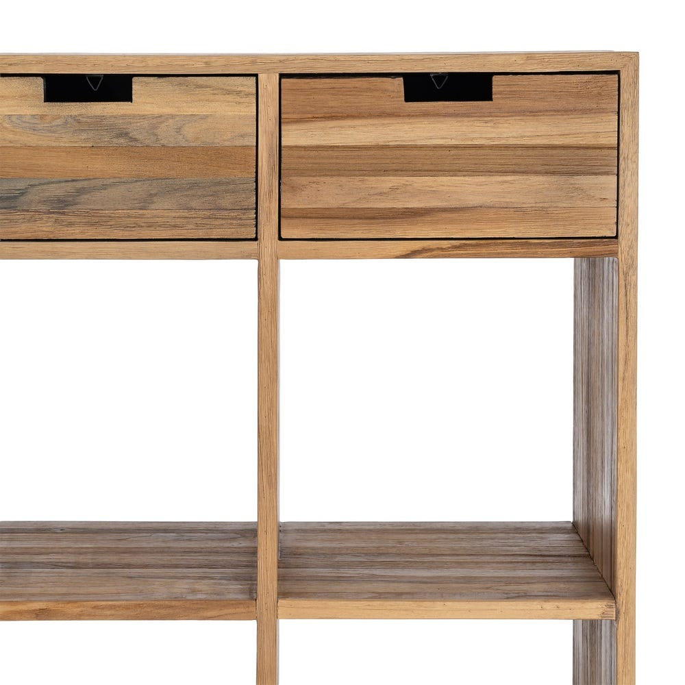 Biblioteca este realizată din lemn reciclat de tec, un material natural care evidențiază textura fibrei și oferă durabilitate piesei de mobilier.