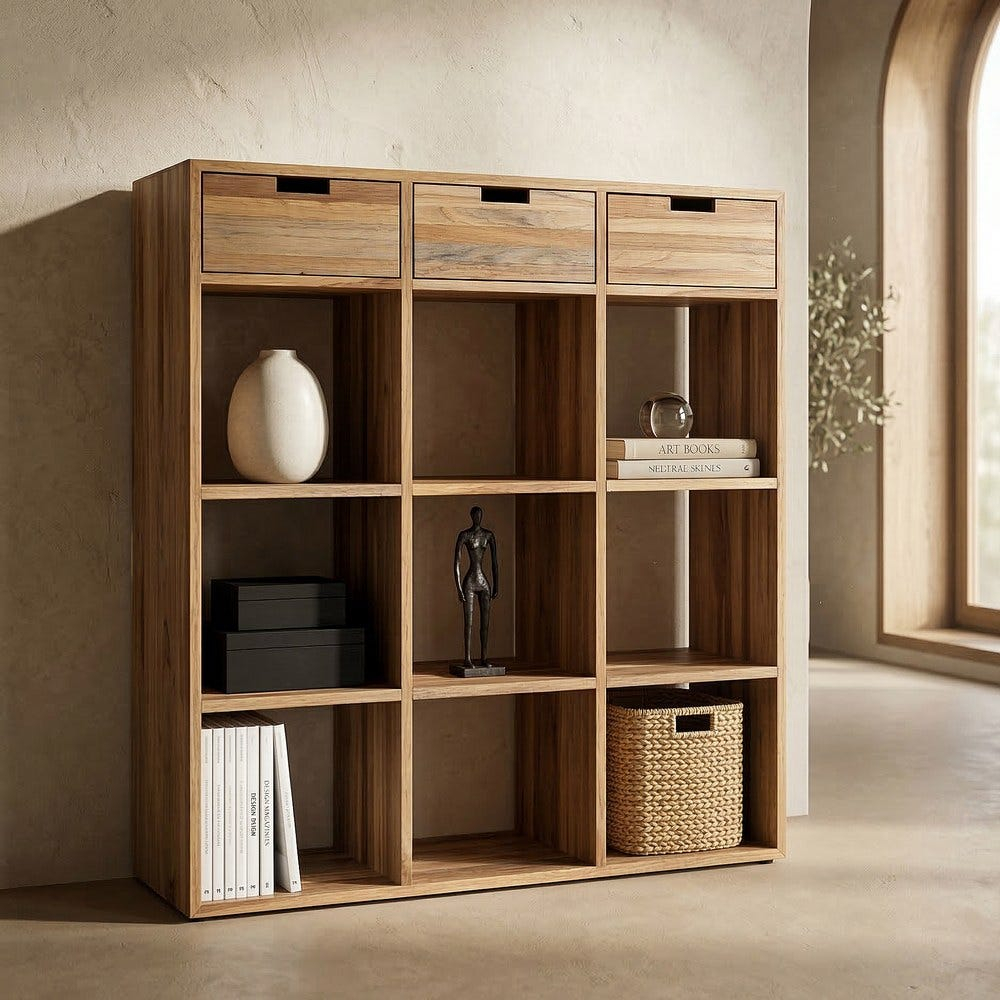 Biblioteca include trei sertare superioare pentru depozitare discretă și nouă compartimente deschise dispuse simetric pentru organizarea cărților sau a obiectelor decorative.