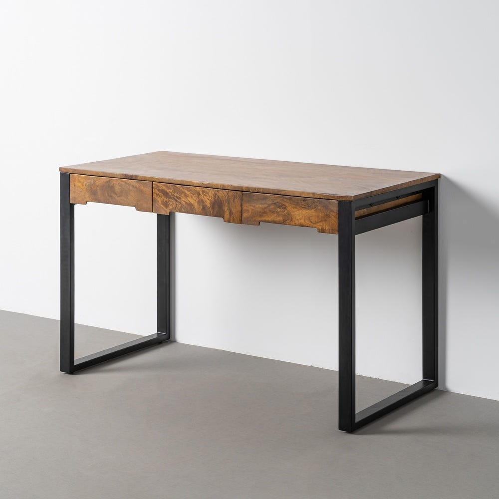 Biroul din lemn de mango cu sertare generoase și structură metalică oferă un echilibru între căldura lemnului și rigoarea liniilor geometrice. Cele trei sertare susțin o organizare clară, potrivită pentru un ritm de lucru ordonat. Designul se integrează ușor în interioare moderne cu accente industriale discrete.